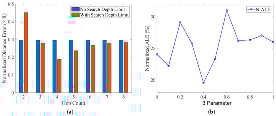 In WSNs, properly setting the search depth not only allows more effective use of anchor node information for localizing target nodes but also enhances the algorithm’s adaptability and robustness. As shown in the experimental results in Figure 10a, we explored the impact of the search depth limit on the error in the estimated distance between nodes, using the multiple of the current communication radius as the evaluation indicator. However, when different search depths are set, the error exhibits a trend of first decreasing and then increasing. Therefore, selecting an appropriate search depth limit can effectively reduce the error in estimated distance and improve localization accuracy. Through multiple simulation experiments, it has been found that the error in estimated distance is minimized when the threshold for search depth is set to .
