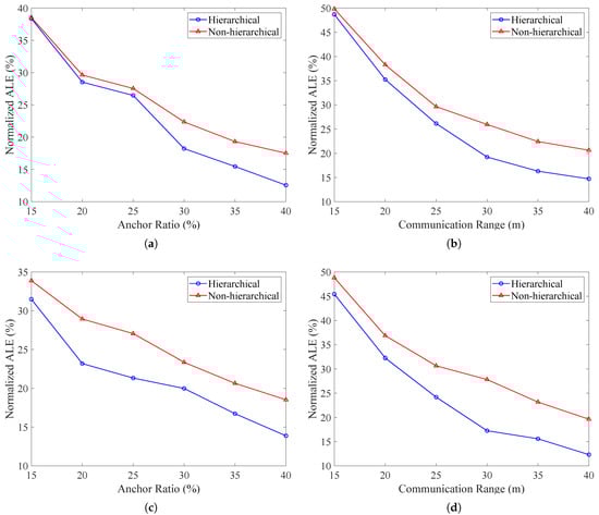 Performance comparison of Hierarchical and Non-hierarchical localization methods under different network conditions. (a) C-shaped area: N-ALE versus Anchor Ratio. (b) C-shaped area: N-ALE versus Communication Range. (c) Square area: N-ALE versus Anchor Ratio. (d) Square area: N-ALE versus Communication Range.