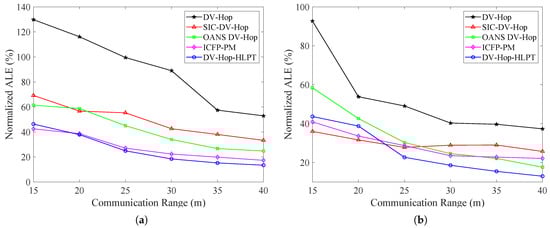 Comparison of N-ALE for different localization methods under different communication ranges. (a) C-shaped area. (b) Square area.