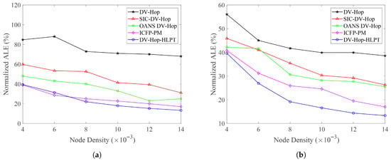 Comparison of N-ALE for different localization methods under different node densities. (a) C-shaped area. (b) Square area.