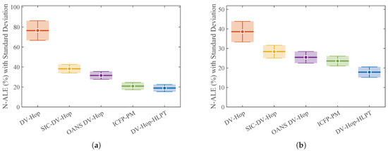 As shown in Table 5 and Figure 14, as node density increases, the proposed DV-Hop-HLPT algorithm can acquire and utilize more effective information, resulting in a corresponding increase in the number of expandable anchor nodes. This change leads to a gradual reduction in average localization error and significant improvement in localization performance. The N-ALE of the proposed algorithm, compared with the other four algorithms, decreases consistently with increasing node density. In the C-shaped region, the average error of DV-Hop-HLPT is reduced by 69.4%, 34.4%, 49.9%, and 8.6% compared with DV-Hop, OANS DV-Hop, SIC-DV-Hop, and ICFP-PM, respectively, achieving the best performance among all compared algorithms. In the square region, the corresponding reductions are 50.2%, 33.6%, 37.5%, and 18.3%, respectively. The outstanding performance under high density demonstrates that DV-Hop-HLPT can effectively utilize additional network information, making it suitable for diverse deployment scenarios where node density may vary. In WSNs, deploying excessive nodes not only increases costs but may also impose a heavier computational burden on the network. To meet localization requirements while optimizing resource utilization, it is generally preferable to minimize the number of deployed nodes. Considering multiple factors, including cost and localization accuracy, the DV-Hop-HLPT algorithm demonstrates a more significant advantage compared with other methods.
