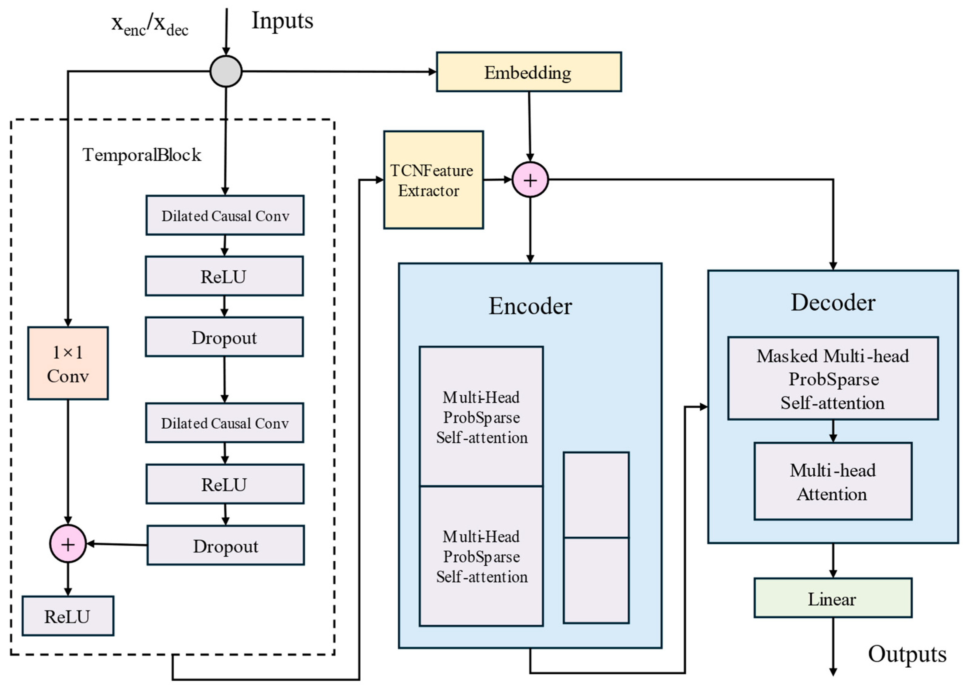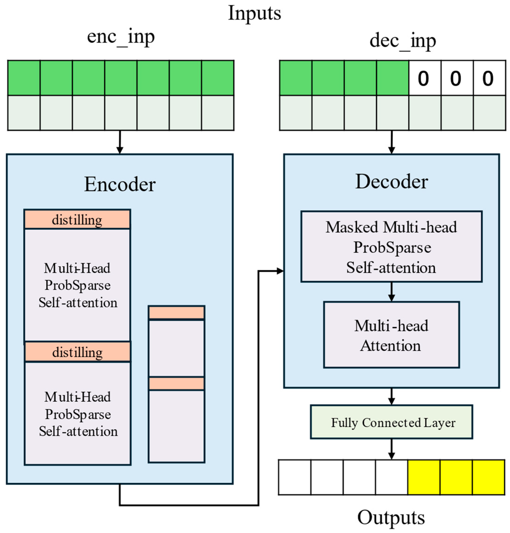 Figure 1. It aims to overcome the quadratic time complexity and high memory consumption of conventional Transformers when handling long sequences, as well as inherent limitations of the encoder–decoder architecture, thereby enhancing predictive capability and efficiency for long-sequence inputs and outputs.