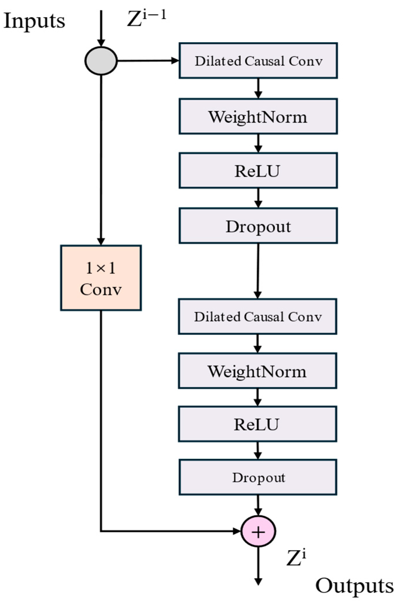 TCN is a general convolutional architecture for sequence prediction, designed to integrate best practices from modern convolutional networks into a concise and efficient starting point for sequence modeling. TCN is constructed within the broader Convolutional Neural Network (CNN) paradigm. CNNs exploit local connectivity and weight sharing to learn hierarchical features via convolutional kernels (1D for sequences, 2D/3D for images and volumes). Convolution in TCN is constructed to adapt to sequence data, preserving causality and long-range dependencies while retaining the efficiency of CNNs. It should be noted that TCN is not an entirely new architecture but rather a descriptive term for a family of architectures. Its core characteristics rest on two key principles: (1) the network adopts causal convolutions to prevent “leakage” of future information, meaning that the output at each time step depends only on the current and past inputs; and (2) it can accept sequences of arbitrary length and map them to output sequences of the same length, similar to the Recurrent Neural Network (RNN).