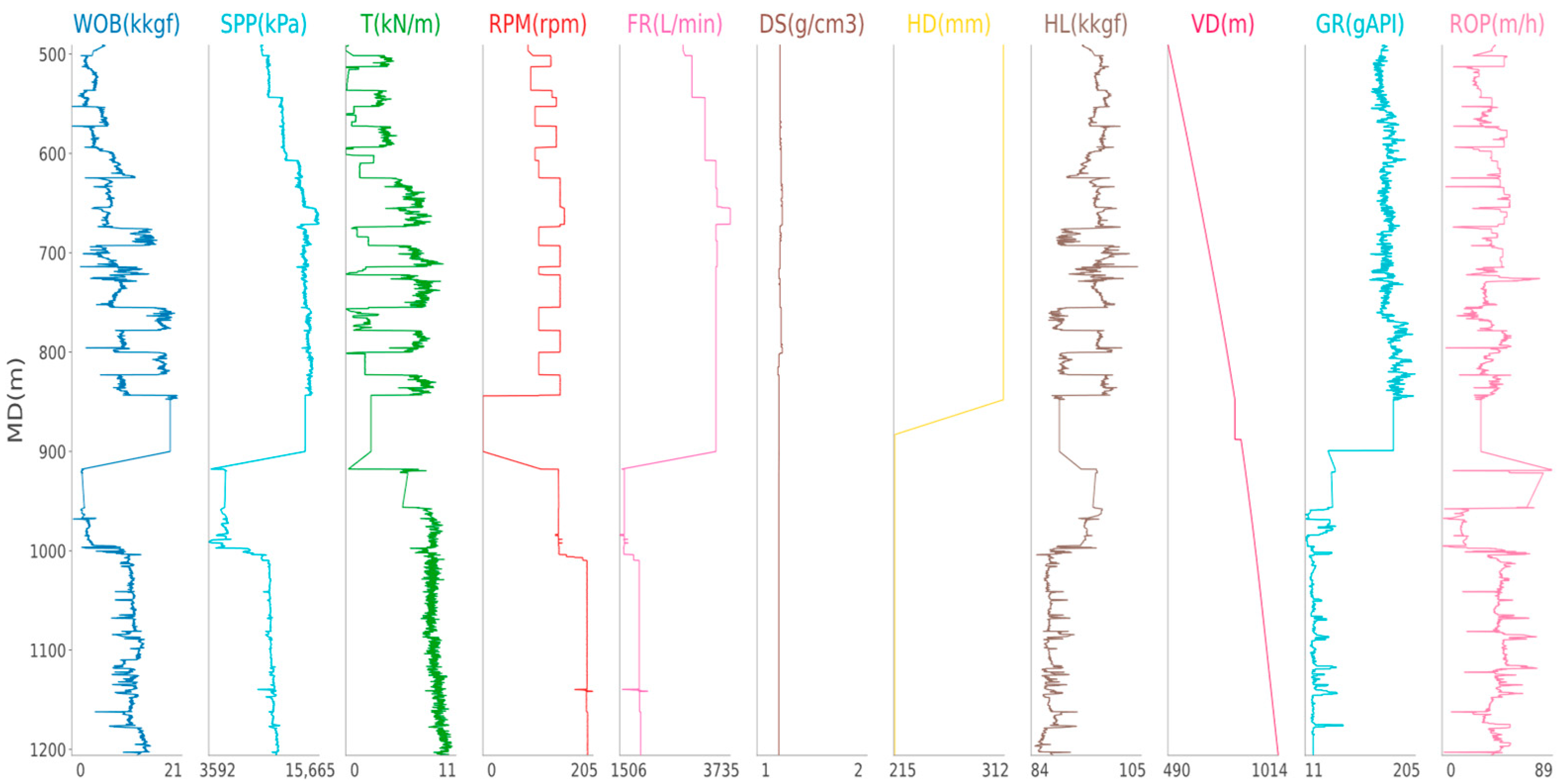 27]. The dataset comprises nearly 200,000 sample records from seven wells and covers 12 common drilling attributes, including measured depth (MD), weight on bit (WOB), standpipe pressure (SPP), surface torque (T), rotary speed (RPM), mud flow rate (FR), mud density (DS), hole diameter (HD), hookload (HL), vertical depth (VD), the USROP gamma value (GR), and ROP. To evaluate the performance of TCN–Informer, this study selected three files from the USROP dataset: USROP_A 0 N-NA_F-9_Ad, USROP_A 2 N-SH_F-14d, and USROP_A 4 N-SH_F-15Sd, hereafter referred to as Well #1, Well #2, and Well #3. To visually illustrate parameter types, lengths, and variations, this paper selects Well #1 for detailed parameter presentation. Data formats for other wells follow the same pattern as Well #1.