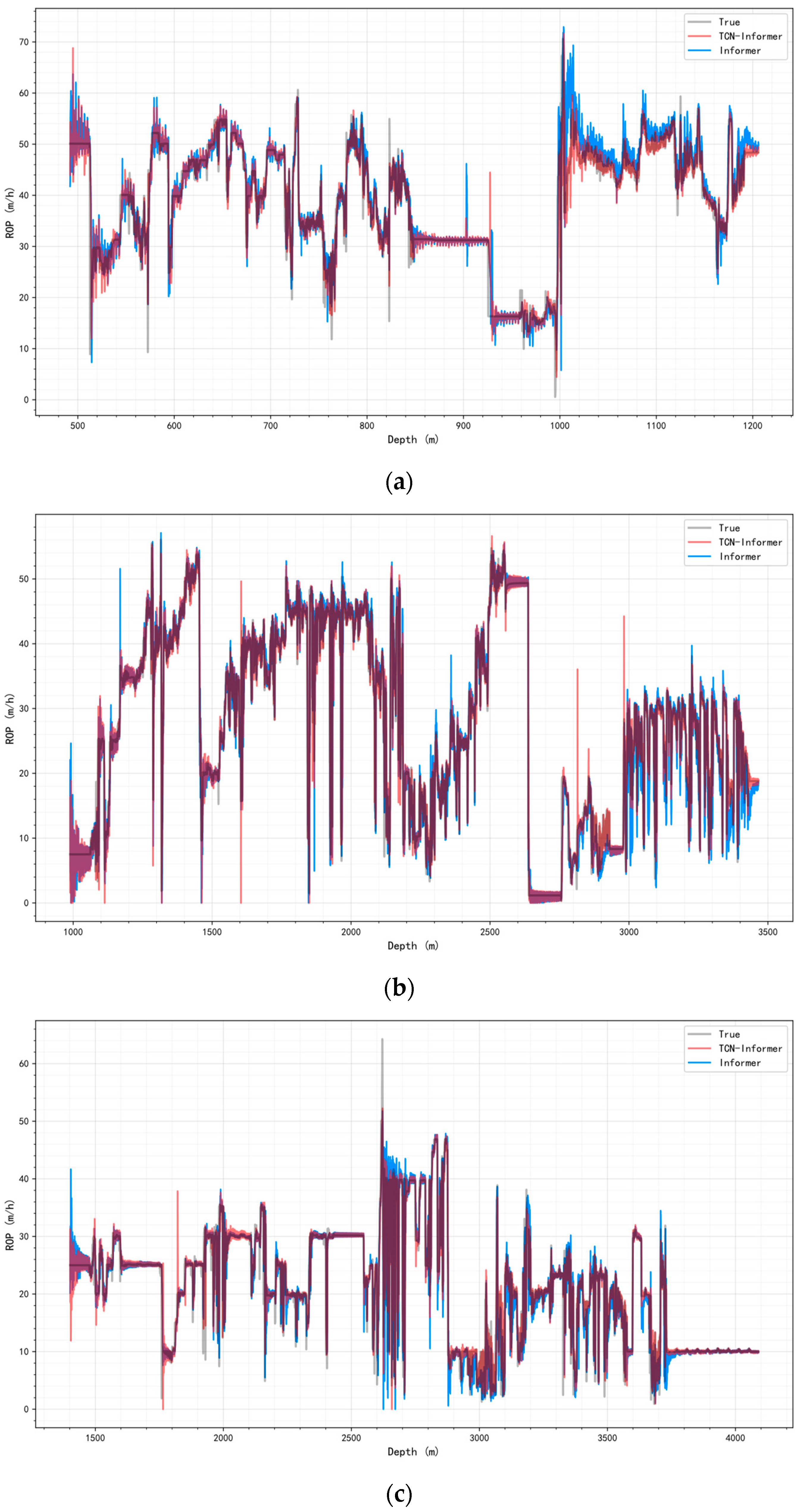 22]. These cross-domain results indicate that Informer has general advantages in scenarios characterized by long sequences, nonstationarity, and sparse critical events. For ROP prediction, this implies that the model can robustly capture a small number of key turning points over long well sections while maintaining scalable inference efficiency.