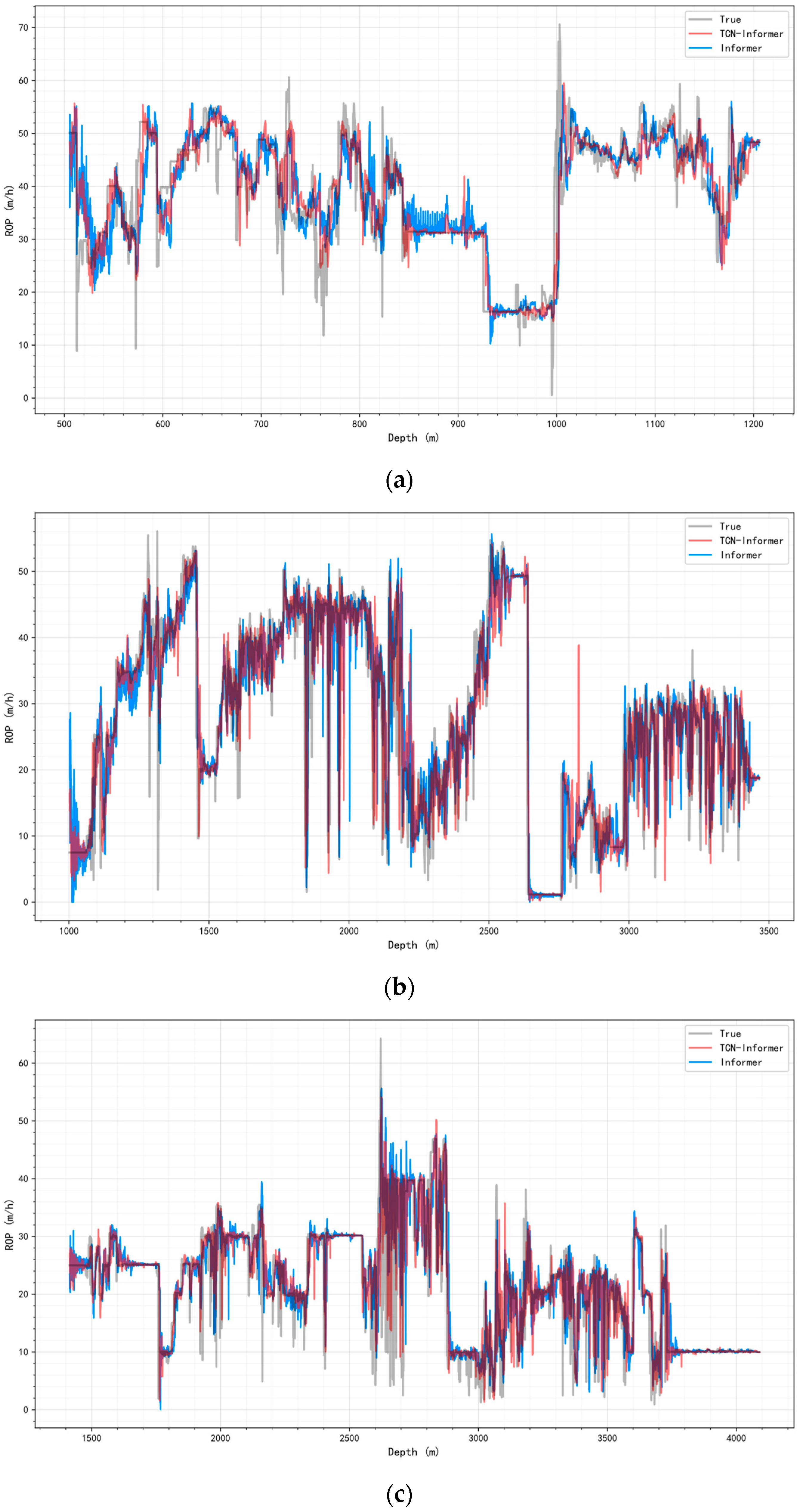 4.5. TCN–Informer vs. Informer ROP Prediction Comparison