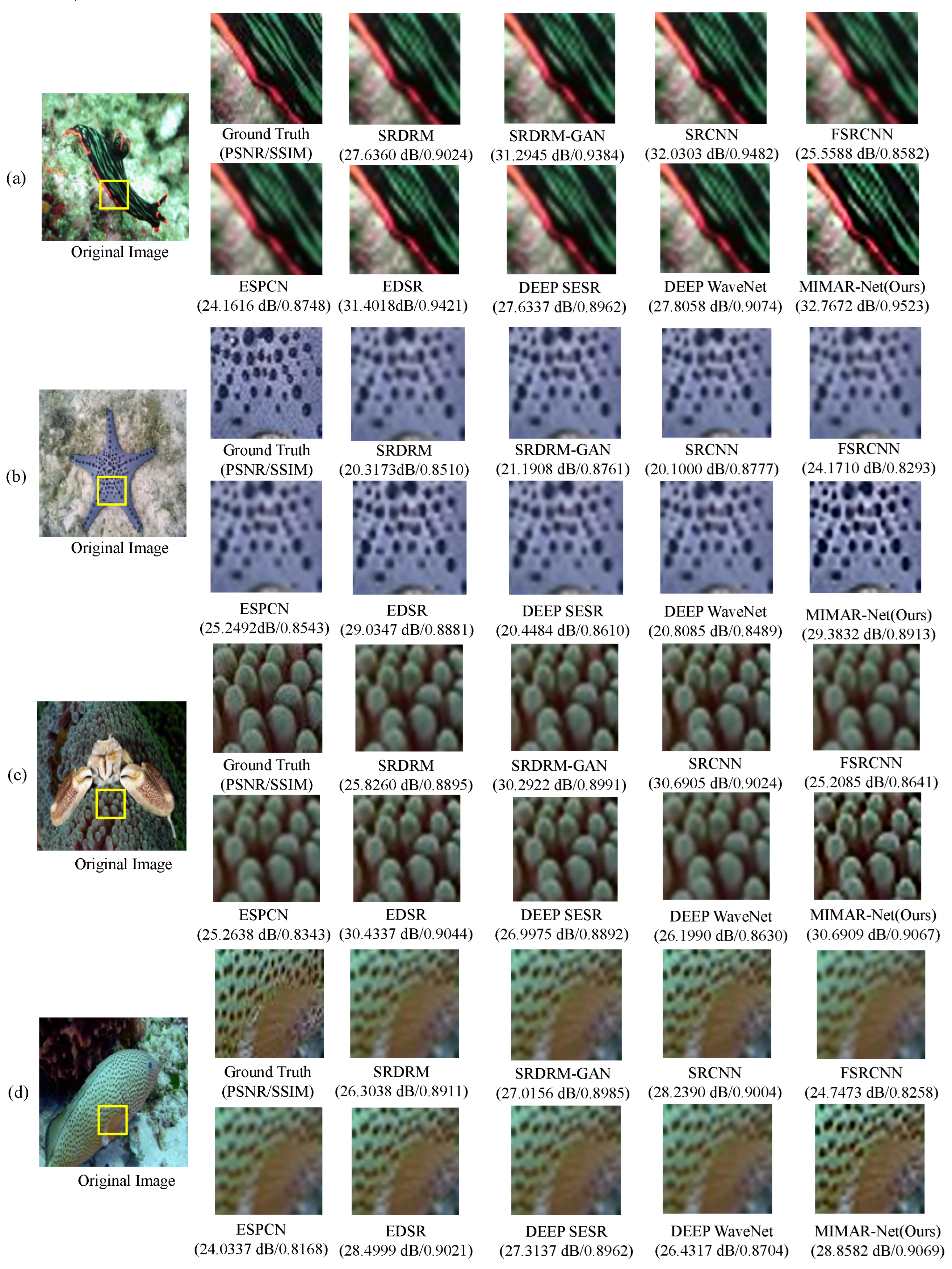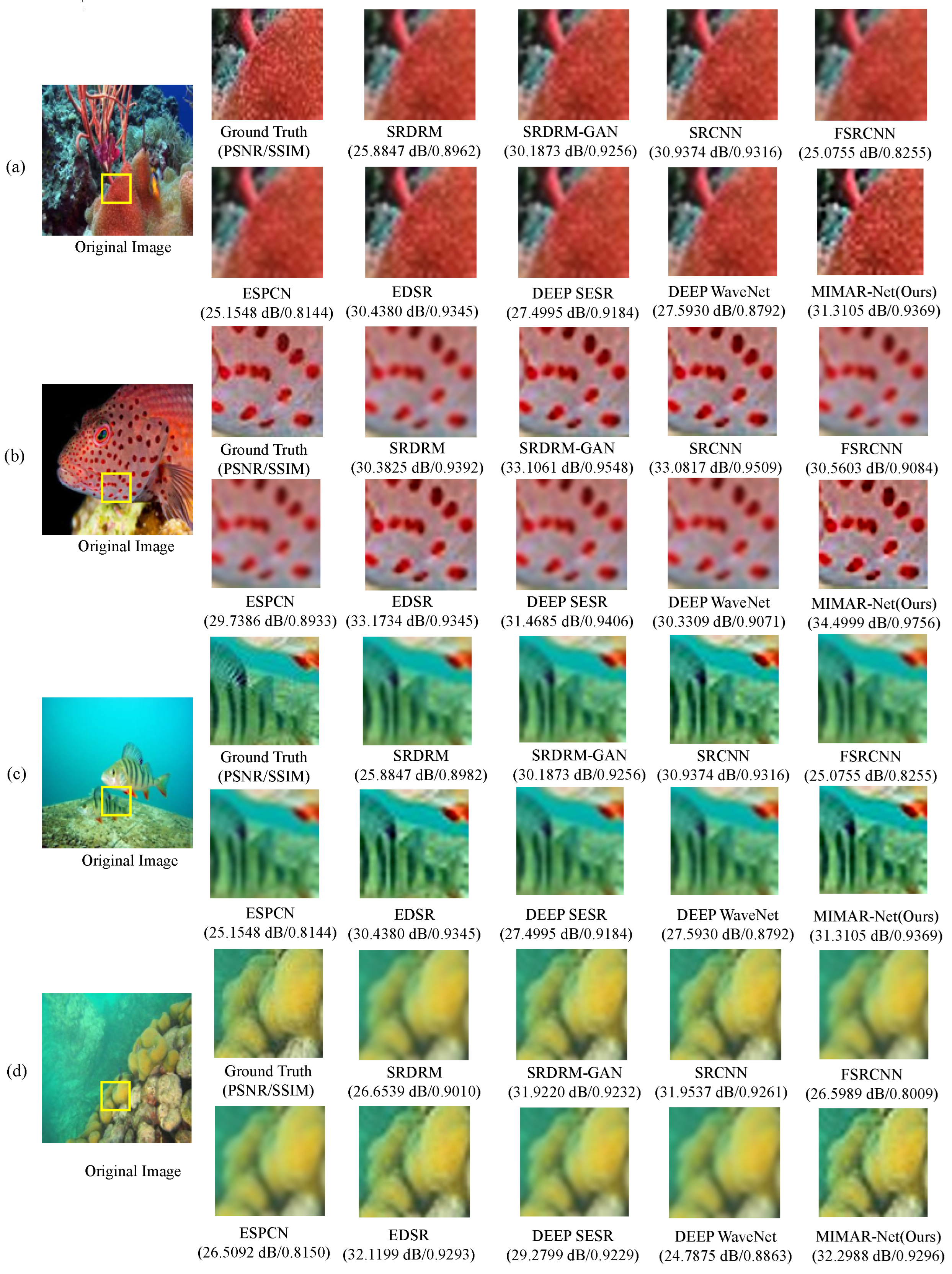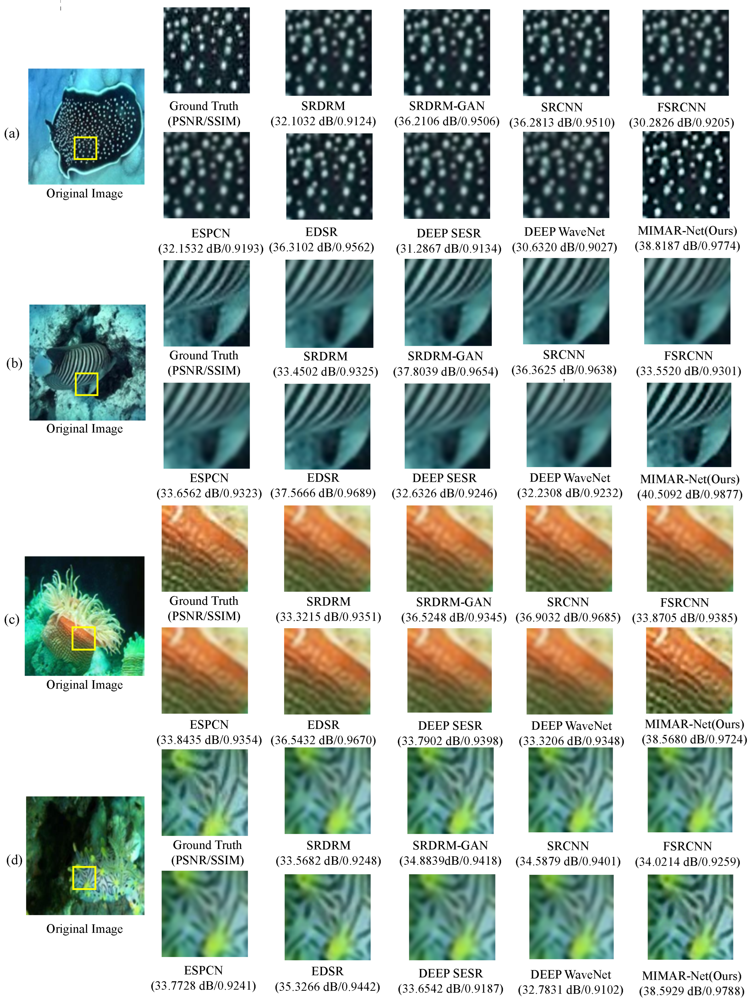 Visual comparisons for upsampling on underwater image sampled from USR-248 dataset. Images (a–d) are different samples images from this dataset.