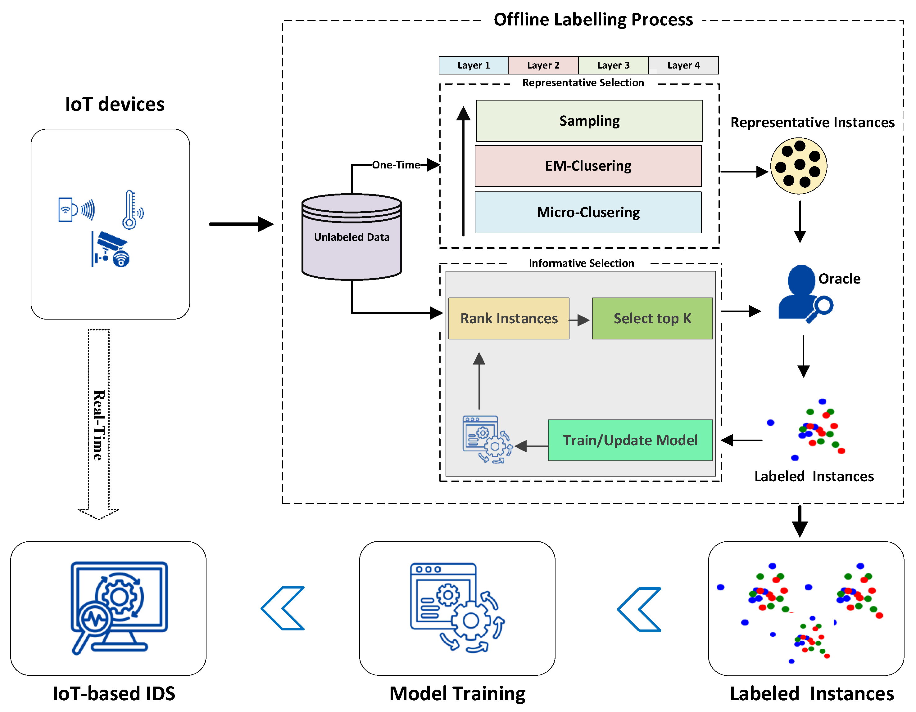 Section 5.1). Similarly, all methods have the same behaviors and order of computational time on a much larger dataset named N-BaIoT. As can be seen, most of the time for the proposed approach is consumed in the first layer, which involves micro-clustering technique and medoid calculations for each cluster, which consumed a substantial part of the time.