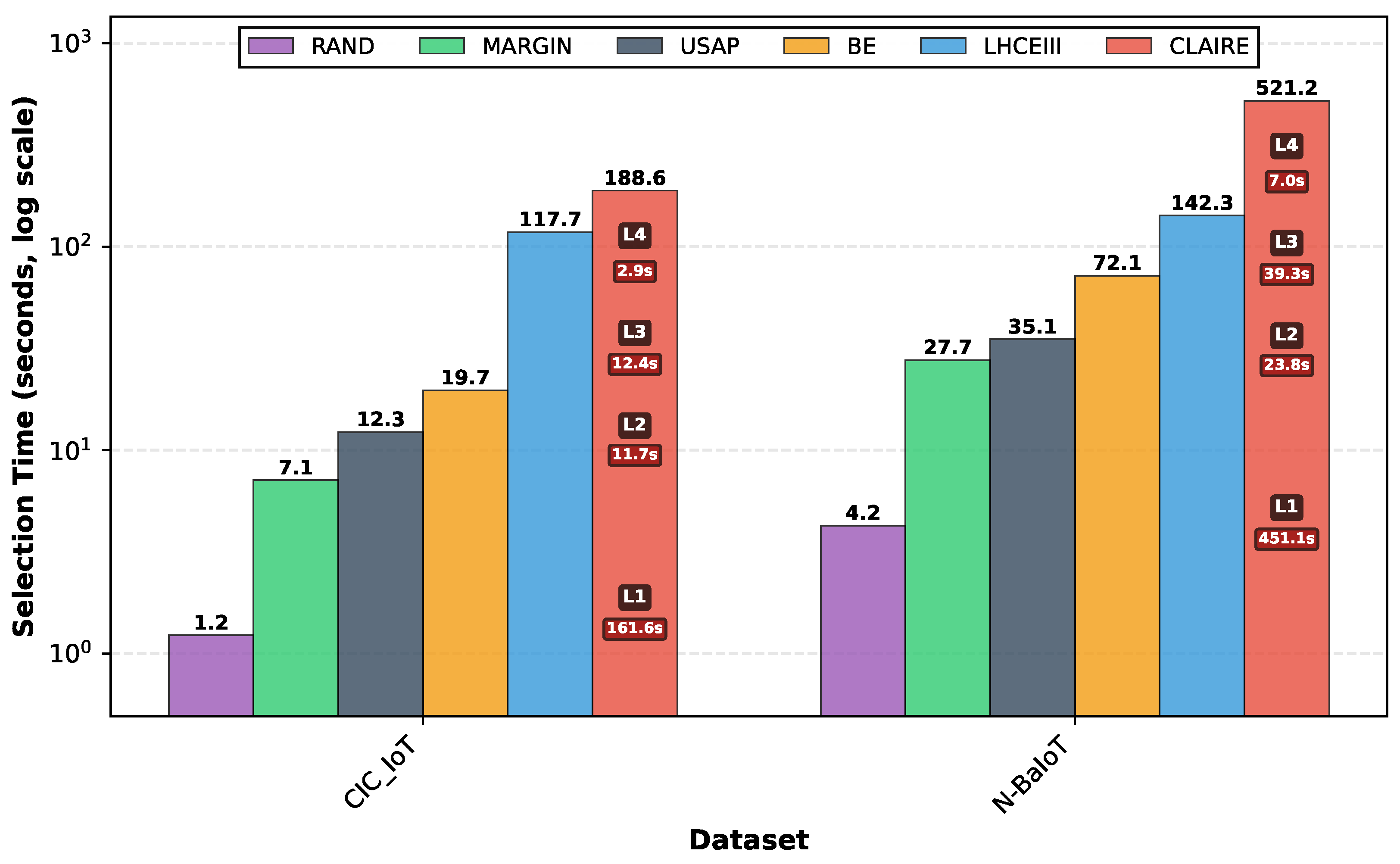 Figure 6, the proposed approach demonstrates large computational time compared to the baseline methods. For example, on the CIC-IoT dataset it takes about 189 s, while the worst and best baseline methods take approximately 118 and 2 s, respectively. In fact, RAND demonstrates the fastest one and this is because it has no intelligent learning part and demonstrates poor results in imbalanced classes (see