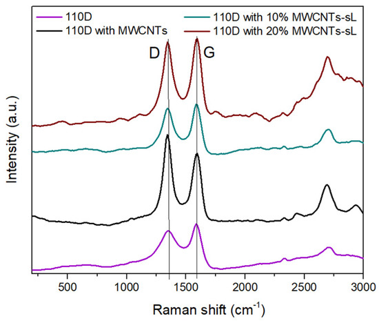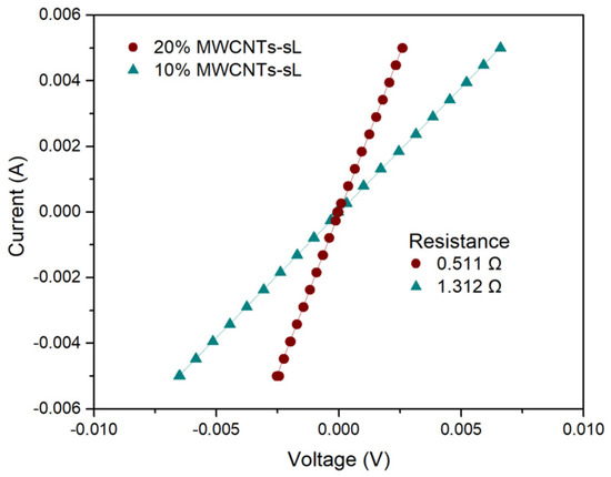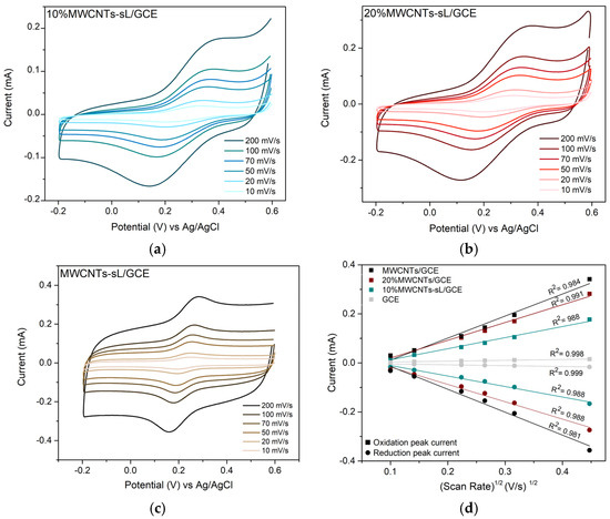 The increasing environmental impact of electronic waste has intensified the pursuit of sustainable materials for manufacturing green electronics. This study presents the development of lignin-based hybrids with multi-walled carbon nanotubes (MWCNTs) via an environmentally friendly ultrasonication process in aqueous medium. Two hybrid materials containing 10 and 20 wt% MWCNTs were synthesized and thoroughly characterized. DLS analysis revealed better dispersion and colloidal stability due to strong physicochemical interactions between lignin and MWCNTs, while SEM and TEM images confirmed a continuous lignin matrix embedding an interconnected MWCNT network. Raman spectroscopy indicated structural ordering within the hybrids. The electrical conductivity of the hybrids reached 2–5 S/cm as evaluated by four-point probe measurements, despite the high lignin content (80–90 wt%). Electrochemical analysis suggested significantly enhanced redox activity and electron transfer kinetics, with measured electroactive surface areas increasing up to 21-fold larger compared with the unmodified electrode. The synergy between lignin and MWCNTs enabled the formation of a conductive network, highlighting these hybrids as promising, cost-effective, and sustainable materials for conductive and electrochemical applications in next-generation green electronics. Full article