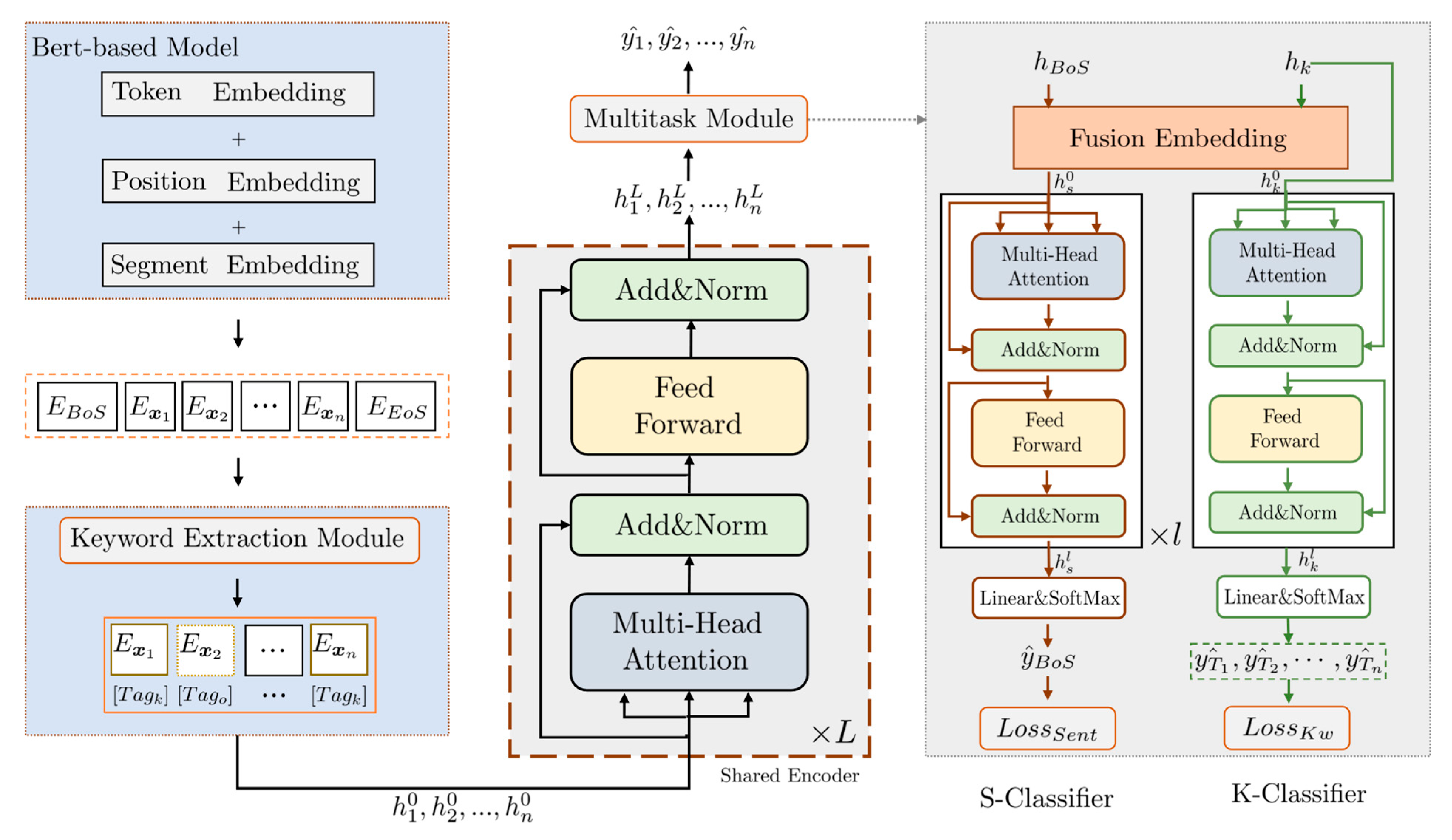 • Fusion and Classification Module (Section 3.2.3): Integrates sentence and keyword embeddings through a fusion strategy, which are then processed by task-specific classifiers to produce the final summary. The system is optimized using a multi-task objective function (Section 3.4) that jointly addresses sentence selection accuracy and keyword identification.