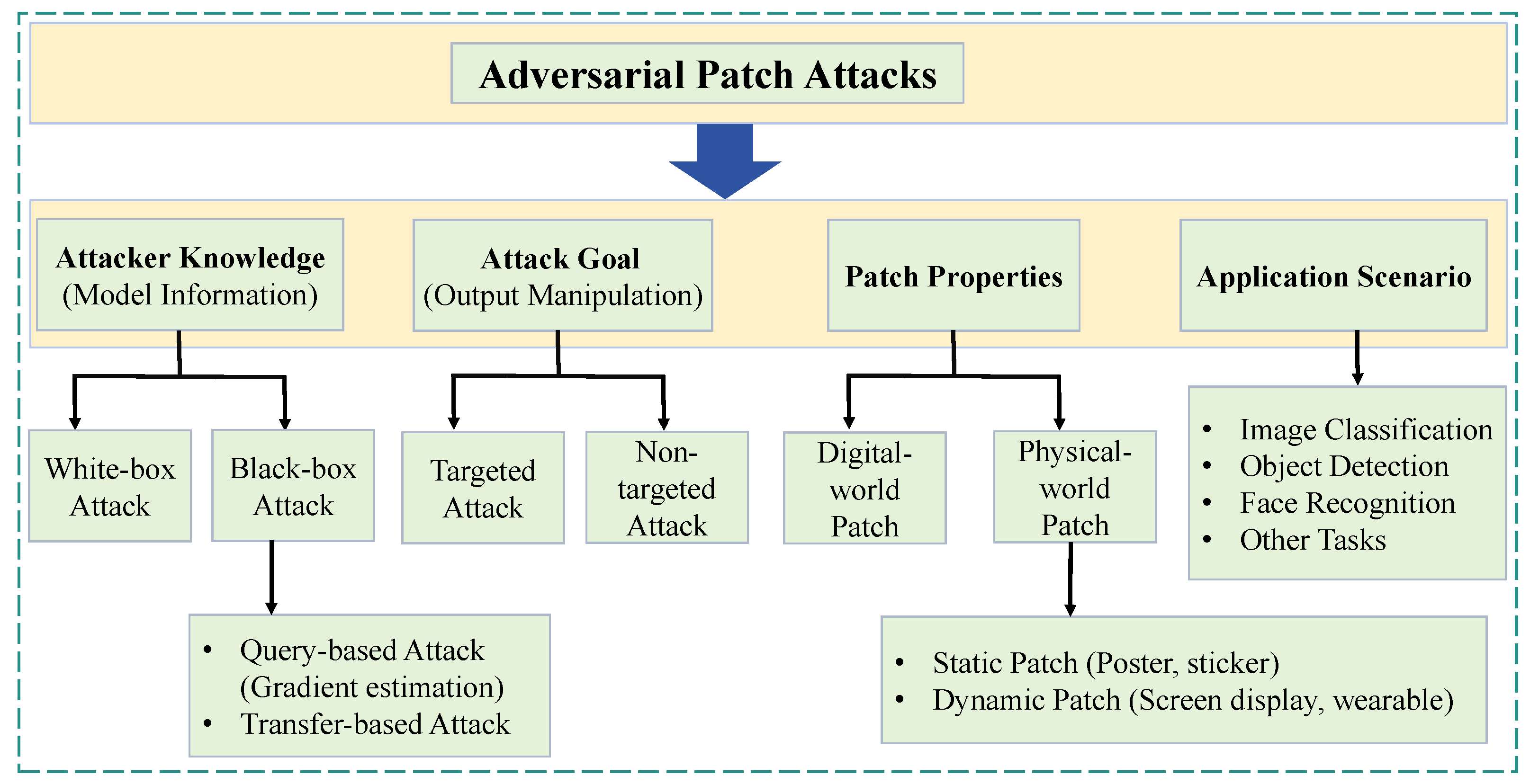 - We introduce a new, task-oriented taxonomy that systematically categorizes patch attack methods according to their downstream vision applications (e.g., classification, detection, segmentation) and defense mechanisms based on three major strategies. This unified framework provides an integrated perspective that bridges attack and defense research.