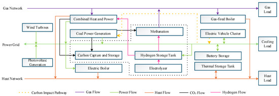 Figure 1 illustrates the electricity–heat–gas integrated energy system considered in this study. The system employs multiple energy conversion and storage devices to achieve deep coupling among the power, heating, and gas networks. On the supply side, wind and photovoltaic generation supply electricity together with a coal-fired power generation unit (CPG). On the conversion and storage side, combined heat and power (CHP) units and electric boilers (EB) establish an electricity–heat linkage; the power-to-gas (P2G) unit generates hydrogen via water electrolysis and synthesizes methane with CO2 captured by the carbon capture and storage (CCS) system, and the resulting methane is injected into the gas network. The gas-fired boiler (GB) supplements heat supply during periods of high heat demand, while batteries, thermal storage tanks, and electric vehicle (EV) clusters provide inter-temporal energy shifting and bidirectional power regulation. The system forms three key coupling paths: an emission–capture–utilization loop that closes the carbon cycle and supports participation in carbon trading; coordinated electricity–heat conversion using CHP units, EBs, and thermal storage; and bidirectional electricity–gas conversion through P2G units and gas-fired units. To reveal the dynamic interactions among the components, the dashed lines in Figure 1 indicate CO2 reduction paths: when renewable generation is abundant, surplus electricity is absorbed by EV charging and P2G units; during peak electricity demand, EV discharging replaces part of the CPG output and, together with P2G–CCS, yields a coordinated carbon reduction effect at the system level. Together, these paths provide a system-level basis for multi-energy coordination and carbon management.