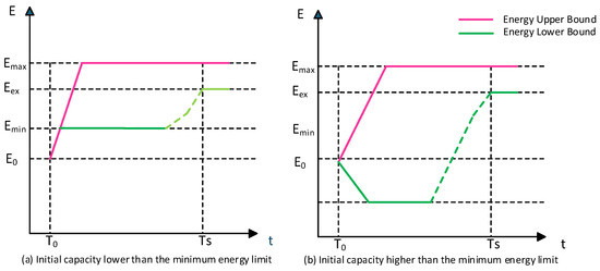 For electric vehicles equipped with the V2G technology, their feasible power domain can be described by the upper and lower energy boundaries. The upper energy boundary corresponds to the trajectory when the EV starts charging at the maximum power immediately after connecting to the grid until the energy reaches the upper limit E max The lower boundary trajectory corresponds to the opposite process. When the initial energy   E 0   of the connected EV is lower than the minimum allowable energy E min   , the system first performs the charging operation until E min   is reached, and then performs the discharging operation, as shown in Figure 2a. If the initial energy   E 0   is higher than E min   , the EV can directly participate in V2G operation, as shown in Figure 2b.
