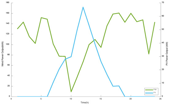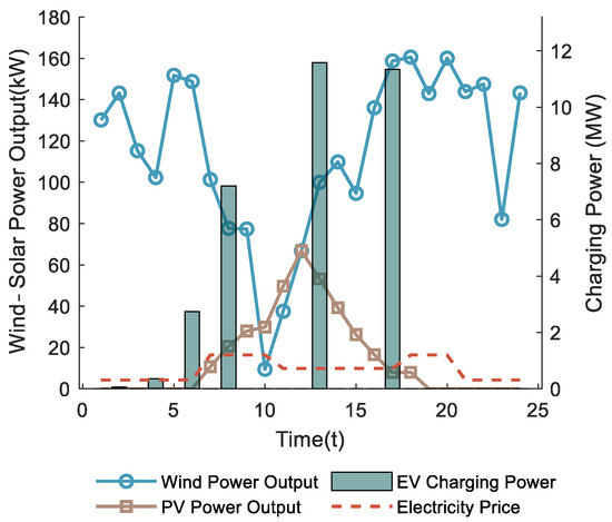 As illustrated in Figure 12, the charging behavior of electric vehicles is highly correlated with the temporal patterns of wind and solar generation. Specifically, between 10:00 and 15:00, when photovoltaic output increases rapidly and remains high, EV charging power rises accordingly, effectively absorbing surplus renewable energy. During nighttime hours with limited solar output, the availability of wind generation enables EVs to maintain a certain level of charging load, indicating efficient utilization of wind energy. These results suggest that, under the proposed scheduling strategy, EVs tend to charge primarily during renewable-abundant periods, thereby enhancing wind–solar energy utilization. Moreover, when the electricity price increases between 17:00 and 21:00 and solar generation is unavailable, EV charging power declines significantly or even halts. This implies that EV charging behavior is jointly influenced by renewable generation and price signals—charging demand is released during low-price periods and suppressed during high-price hours, thus mitigating the system’s economic burden during expensive intervals.