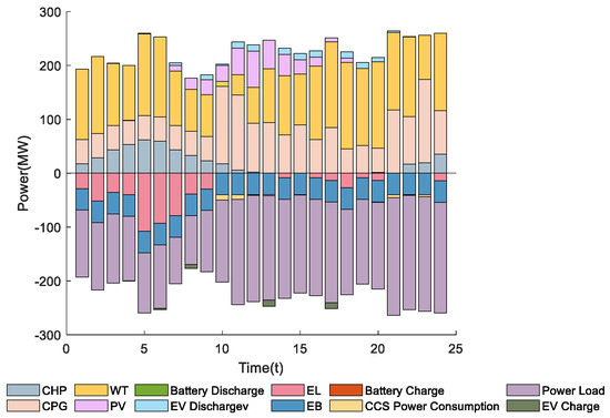 As shown in Figure 6, the P2G unit primarily operates between 00:00–09:00, when electricity demand is low. During this period, surplus electricity is converted into natural gas and hydrogen, lowering purchase costs while providing gaseous reserves for subsequent peak periods. Coal-fired generation decreases when wind output is high, whereas during 22:00–10:00, when wind and PV are limited, it jointly supplies power with CHP. The discharging of electric vehicles mainly occurs between 11:00–20:00, whereas charging is observed around 8:00, 13:00, and 17:00. This pattern arises because the electrical load reaches its peak from afternoon to evening, when the system experiences higher supply pressure; EV discharging during this period effectively mitigates peak power shortages and reduces operational costs. In contrast, during morning and midday hours with sufficient photovoltaic generation or lower electricity prices, EVs tend to charge, absorbing surplus renewable energy and thereby strengthening the system’s peak-shaving and valley-filling capability. Because it is more economical to use P2G and EV clusters for flexibility, the battery storage unit remains idle