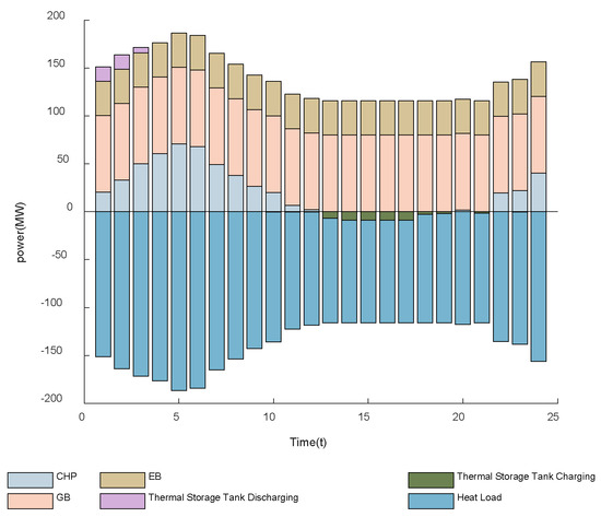 Figure 7 presents the thermal power balance of the system. The heat load is mainly covered by CHP, EB, and GB units, while thermal storage provides supplementary output when demand exceeds generation capacity. The adopted operation strategy, characterized by nighttime discharging and midday charging, mitigates peak stress on primary equipment and improves the overall efficiency of energy utilization.