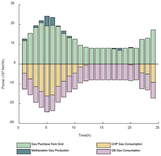 To further analyze the operational features of the integrated energy system on a typical day, Figure 6, Figure 7, Figure 8 and Figure 9 depict the energy balances of electricity, heat, gas, and hydrogen. The results confirm that multi-energy coupling and coordinated scheduling enable effective supply–demand matching and smooth energy conversion.