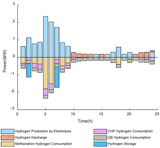 Figure 9 illustrates the hydrogen energy balance, indicating that the hydrogen consumed by the methanation reactor, gas boiler, and combined heat and power (CHP) unit is produced via water electrolysis. The hydrogen storage tank acts as a buffer to absorb or release hydrogen at different time periods. During the early hours of low load and electricity price, the system mainly performs hydrogen production and storage. From noon to evening, hydrogen production and consumption remain roughly balanced, reflecting the operation of hydrogen blending in the gas network. At night and around peak-demand periods, methanation and hydrogen blending demand increase, and the hydrogen storage shifts from charging to discharging to support hydrogen utilization. This sequential transition of “production–storage–utilization” enables cross-period energy transfer and contributes to peak shaving and valley filling: on one hand, it provides a stable hydrogen source for CO2 methanation and reduces dependence on external natural gas purchases; on the other hand, it enhances renewable energy utilization and promotes low-carbon operation of the integrated energy system.