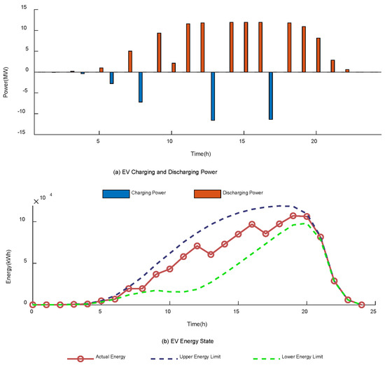 To investigate the charging and discharging behavior of the electric vehicle cluster under typical wind–solar generation scenarios, the 24 h profiles of charging/discharging power and state of energy are extracted from the simulation results of the proposed optimal scheduling model. Figure 10 illustrates the asymmetric charging and discharging pattern of EV clusters under the V2G mode. The charging power is 33.28 MW, whereas the discharging power reaches 111.34 MW, which is 3.31 times higher. The strategy tends to provide high-power discharging support during periods of high electricity prices. This “shallow charging and deep discharging” pattern enables EVs to play a critical role in peak shaving and valley filling. Notably, during price peaks, discharging power rises rapidly to 9.36 MW with a response rate exceeding 4.02 MW/h, demonstrating strong responsiveness to market signals. According to the calculated data, the dynamic available capacity of the electric vehicle (EV) cluster fluctuates throughout the day, with an average upper limit of 69.6 MWh and an average lower limit of 24.2 MWh. Considering only the effective periods when the available capacity is greater than zero, the average SOC utilization rate is approximately 46%, indicating that the system retains about 54% of redundant margin to cope with uncertainties while maintaining scheduling flexibility. In addition, the actual energy in certain time periods approaches the upper and lower capacity limits, suggesting that the operational strategy has sufficient capability for both energy release and absorption under extreme conditions, whereas during most periods it remains at the mid-level range of the capacity interval, achieving a balance between economic efficiency and operational security.
