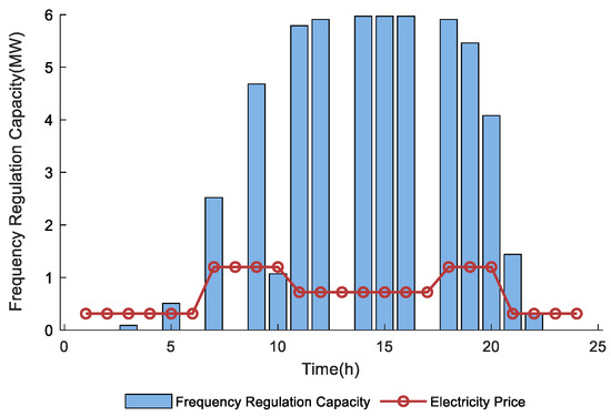 Figure 11 illustrates the dynamic relationship between the regulation capacity of EV clusters and electricity prices. Regulation capacity strongly correlates with price trends: it rises sharply during price increases and stabilizes at 5–6 MW when prices remain high, highlighting the high sensitivity of V2G clusters to market signals. During low-price periods, the capacity nearly falls to zero as the system actively preserves reserves, whereas during peak-price hours, the capacity approaches its maximum, indicating full deployment of flexibility resources for maximum revenue. Notably, between 14:00 and 18:00, the regulation capacity reaches saturation without further increase, reflecting the physical power boundary constraints of the system.