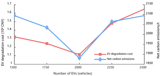 As shown in Figure 13, when the number of EVs increases from 1500 to 2000, the larger fleet scale enhances the regulation capability of the integrated energy system. On the one hand, EVs charge during load valleys to absorb surplus renewable energy and discharge during peak periods to replace high-carbon generation, which effectively reduces system-level carbon emissions. On the other hand, the revenue from V2G ancillary services increases markedly and offsets the battery degradation cost, thereby improving both the low-carbon performance and the economic performance of the system. When the number of EVs is further increased to 2500, the aggregate charging power of the EV fleet exceeds the renewable absorption capability of the system in certain periods. To satisfy this large scheduling requirement, the system has to dispatch conventional units with higher marginal carbon intensity, which induces additional indirect carbon emissions. At the same time, market saturation reduces the average V2G revenue, whereas deeper discharging further accelerates battery degradation. Therefore, an EV population of around 2000 constitutes a near-optimal scale range for this system: it maintains system flexibility and renewable energy absorption while achieving a joint optimum between EV degradation cost and net CO2 emissions.