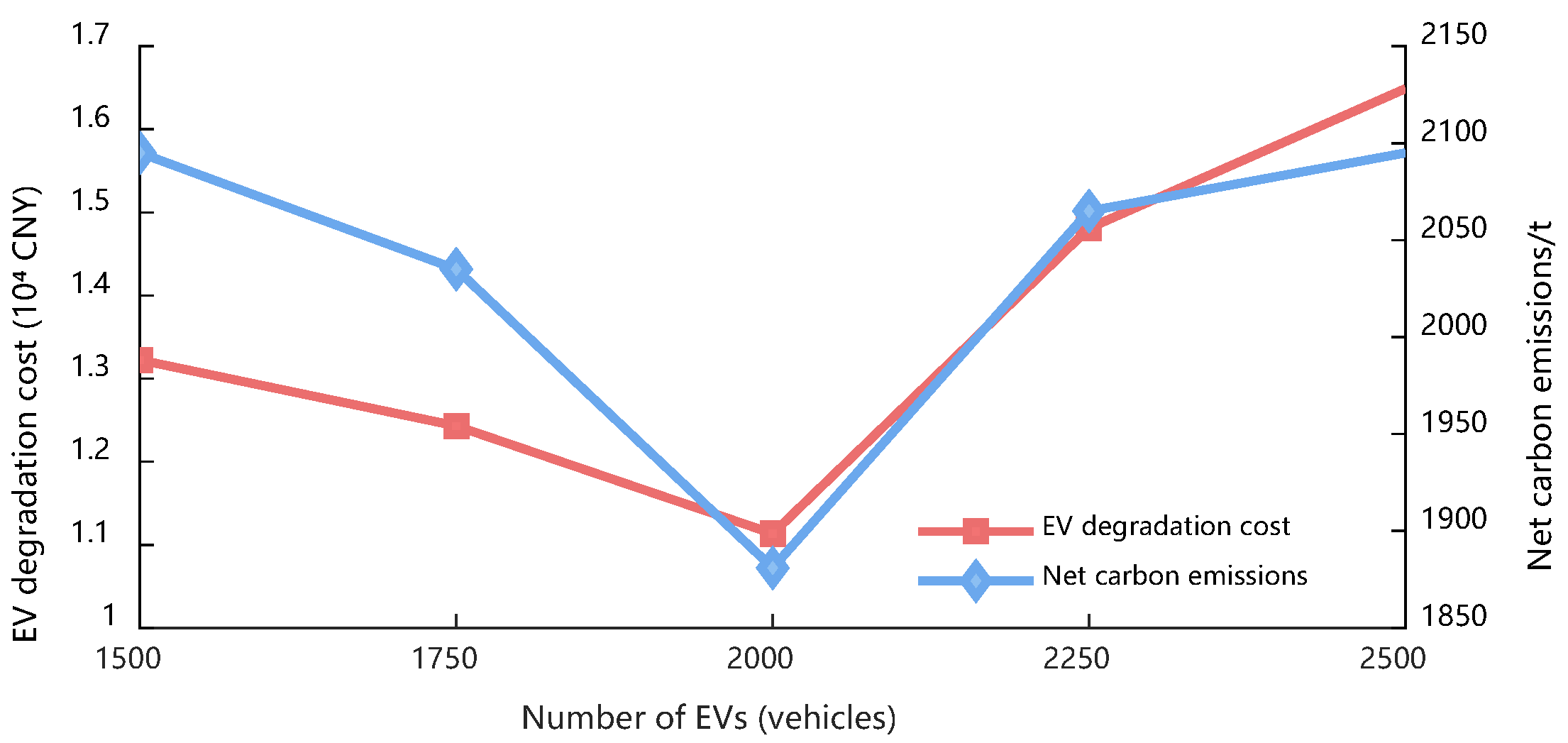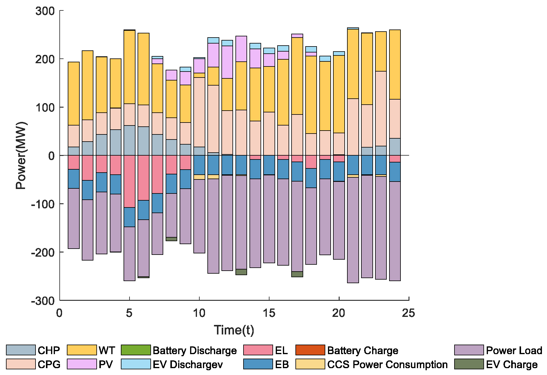 - This paper develops a low-carbon economic dispatch model for a park-level integrated energy system that includes the coordinated operation of an electric vehicle (EV) cluster and a P2G–CCS scheme, and conducts quantitative comparative analysis of simulation results under multiple scenarios to obtain the following conclusions and outlook. Battery degradation and economic balance: During charging and discharging, EVs inevitably incur battery degradation cost. Simulation results indicate that the revenue from V2G ancillary services can offset about 91% of this degradation cost, keeping the net loss due to degradation at a very small and acceptable level. Although the degradation cost is not fully offset, its impact on the overall economic performance of the system is limited and does not reduce the value of EVs as flexible regulation resources.