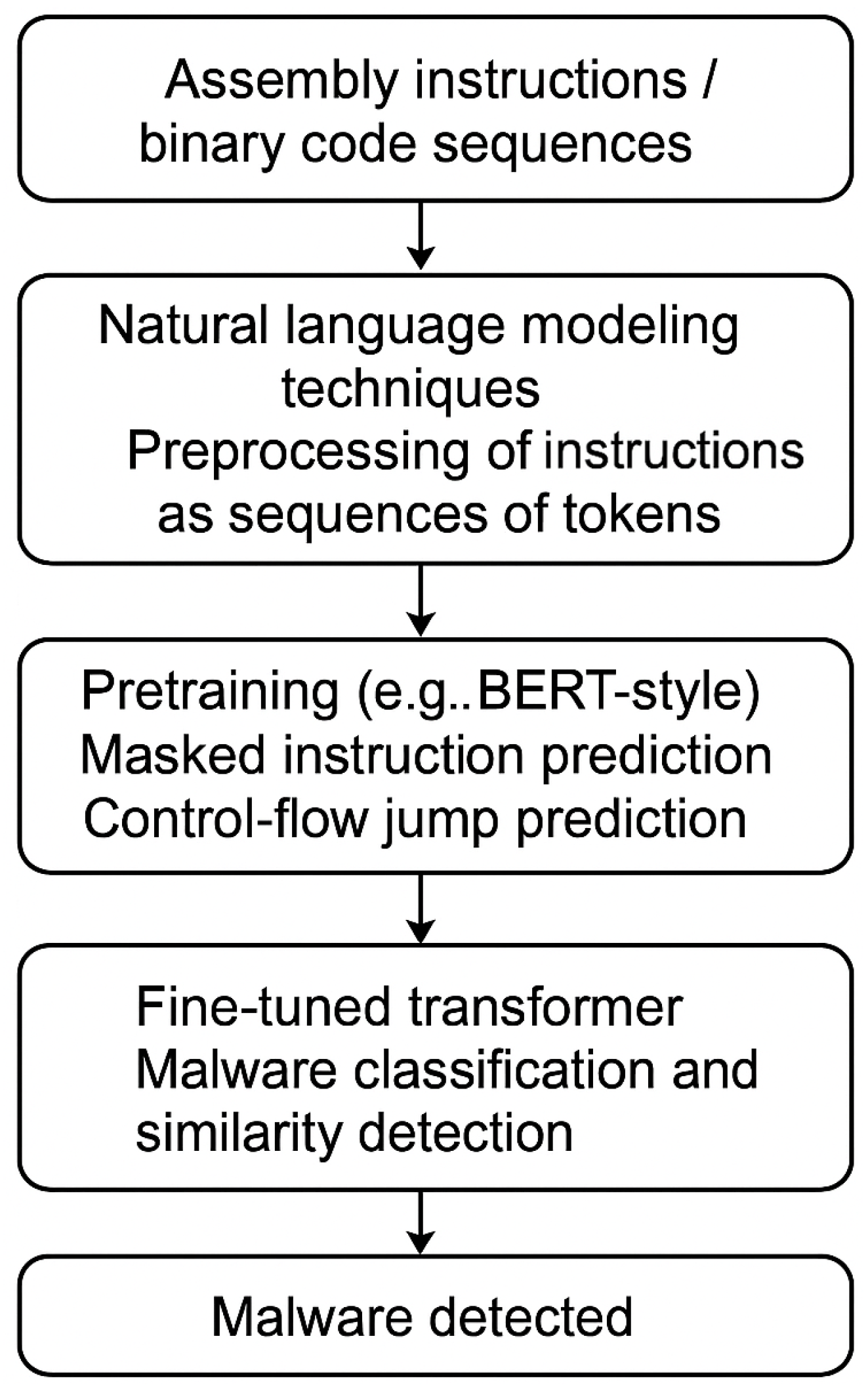 Figure 1, the typical workflow begins by treating raw binaries as sequences, analogous to natural language tokens. These sequences undergo tokenization and embedding, followed by pretraining using NLP-inspired objectives such as masked token prediction or control flow modeling. The pretrained models, typically based on transformer architectures like BERT, can then be fine-tuned for downstream malware classification tasks. This pipeline enables the extraction of rich, contextual representations from binary code, offering improved detection accuracy and better generalization across diverse malware families. As transformer-based NLP continues to advance, with developments such as RoBERTa, GPT-style models, and domain-specific pretraining objectives, future research should explore their potential to enhance robustness against adversarial samples and adaptability to emerging threats in cybersecurity.