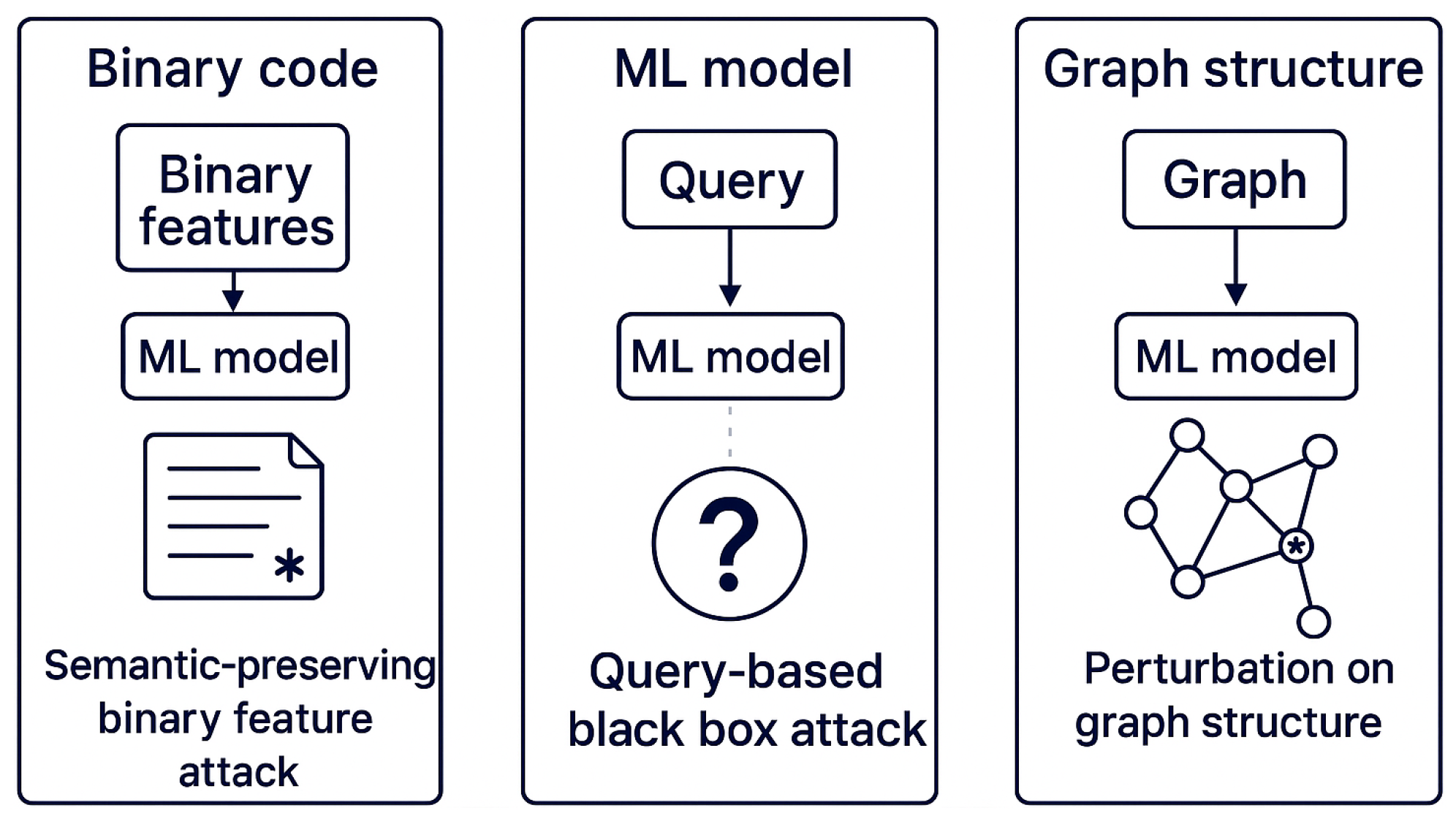 Figure 6 provides a visual summary of several representative adversarial evasion strategies discussed in this subsection. The figure categorizes evasion attacks into three primary scenarios: (1) semantic-preserving feature perturbation in binary code, where carefully crafted modifications are made to binary features without altering program behavior; (2) query-based black-box attacks, in which an adversary interacts with a model through API access to infer vulnerabilities and generate adversarial inputs; and (3) structural perturbation in graph-based models, where modifications to graph topology (e.g., node connections or attributes) are used to evade detection. These attack vectors reflect the diversity of evasion techniques across data modalities and model types, underscoring the need for robust and adaptive defenses.