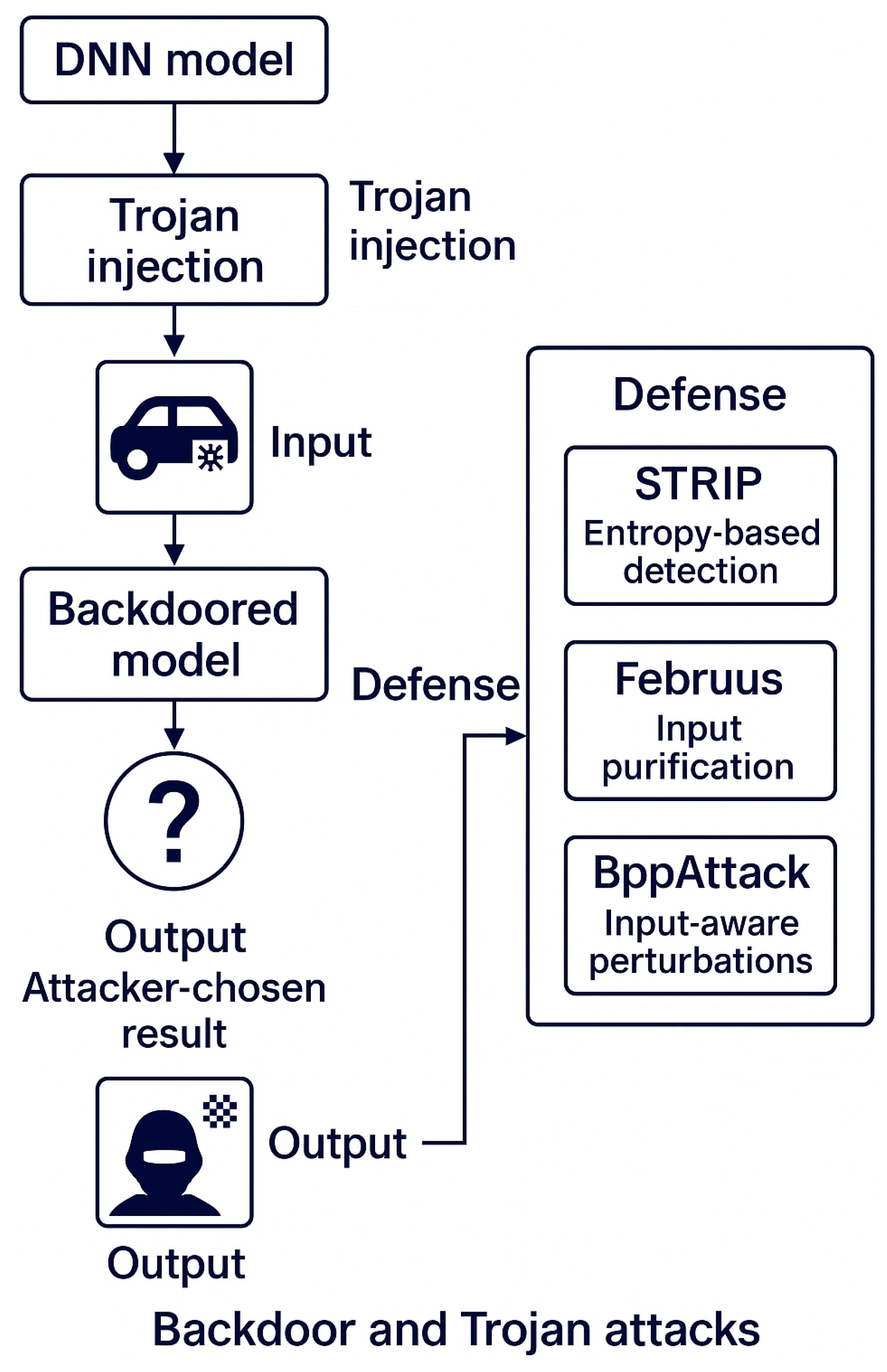 Figure 7 provides a visual summary of typical backdoor and trojan attack scenarios in adversarial machine learning. The figure highlights three main components of this threat landscape: (1) the attacker inserts a trigger into selected inputs during the training phase, (2) the compromised model learns to associate the trigger with an attacker-specified class, and (3) during inference, the presence of the trigger reliably causes a misclassification, while clean inputs are correctly classified. This illustrates both the stealth and potency of such attacks. Additionally, the figure includes defense mechanisms such as entropy-based detection (e.g., STRIP) and input purification (e.g., Februus), which attempt to mitigate these threats by analyzing model behavior at runtime or modifying input data to neutralize potential triggers. Together, these elements reflect the cat-and-mouse dynamics between attack strategies and defensive countermeasures in trojaned ML systems.