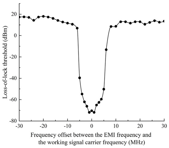 Setting , the test loss-of-lock threshold curve is shown in Figure 3. The data link is highly sensitive to in-band interference within a frequency offset () range from −5 MHz to 5 MHz. refers to the interference frequency minus the working signal carrier frequency. The loss-of-lock threshold increases as the absolute value of the frequency offset increases. In contrast, the data link demonstrates low sensitivity to out-of-band interference, showing higher loss-of-lock thresholds and a small frequency-dependent manner. The interference loss-of-lock thresholds can be obtained by tests or machine-learning algorithms as the foundation for assessing complex EMI effects.