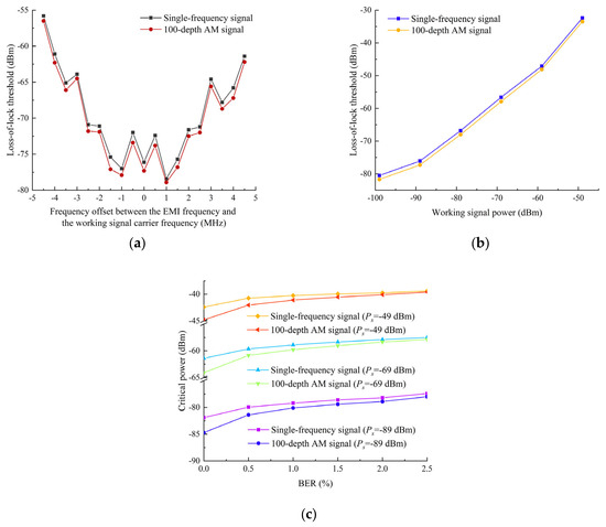 To assess the complex EMI effects in this study, parameters , , and IM3 effect factor are required. According to Section 2.4, the loss-of-lock thresholds of single-tone and 100% depth AM signals need to be tested, the results of which are shown in Figure 4. Figure 4a presents the loss-of-lock thresholds under different when . The loss-of-lock thresholds for AM signals are lower than those for single-tone signals. This means that the data link is more susceptible to the AM interference. Figure 4b shows the thresholds at under varying working signal powers, which reveals nearly parallel threshold curves, suggesting that the difference between their loss-of-lock thresholds remains relatively constant regardless of working signal power variations in the range from −99 dBm to −49 dBm. Figure 4c indicates the critical power of single-tone and AM signals under different BER, at and , −69 dBm, and −49 dBm. As the BER increases, the critical power also increases. The trend of critical power is consistent under different working signal powers. As the BER increases, the power difference between the single-tone and AM signals decreases.
