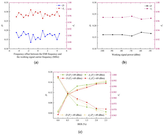 Results of parameters At and D. (a) Parameters versus frequency offset at a working signal power of −89 dBm; (b) parameters versus working signal power at 0 MHz frequency offset; (c) parameters versus BER at 0 MHz frequency offset under working signal powers of −89 dBm, −69 dBm, and −49 dBm.