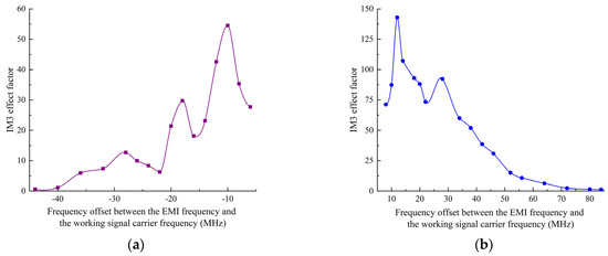 The IM3 effect factors at various frequency points of the data link have been measured in [19] with the test working signal power of −87 dBm. The IM3 effect factor curves are shown in Figure 6. Figure 6a and b show the IM3 effect factors of the frequencies with negative and positive frequency offsets, respectively.