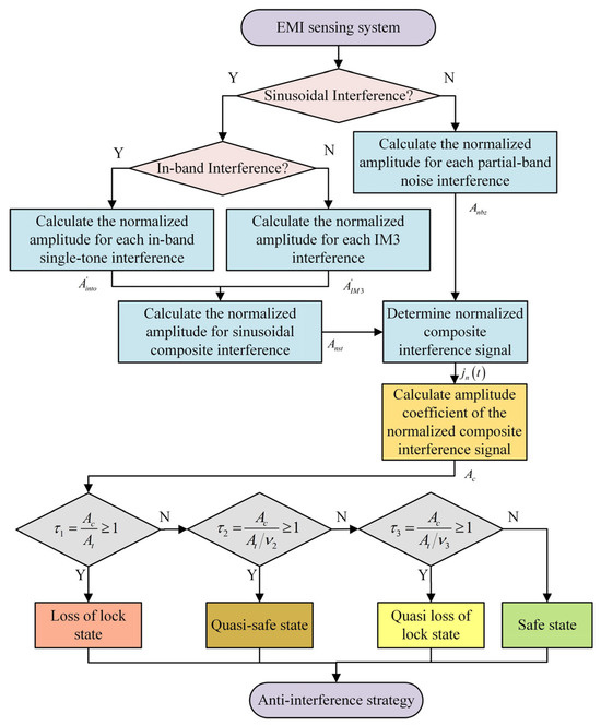 Based on the different states of a data link, its working status is classified into four states: loss-of-lock state, quasi-loss-of-lock state, quasi-safe state, and safe state [17]. Correspondingly, the complex EMI effect index from Section 2.2 is stratified into three levels: first-level effect index , second-level effect index , and third-level effect index . As the interference amplitude decreases across the four states, need to be reduced in the three critical states. The three effect indexes are denoted as follows: