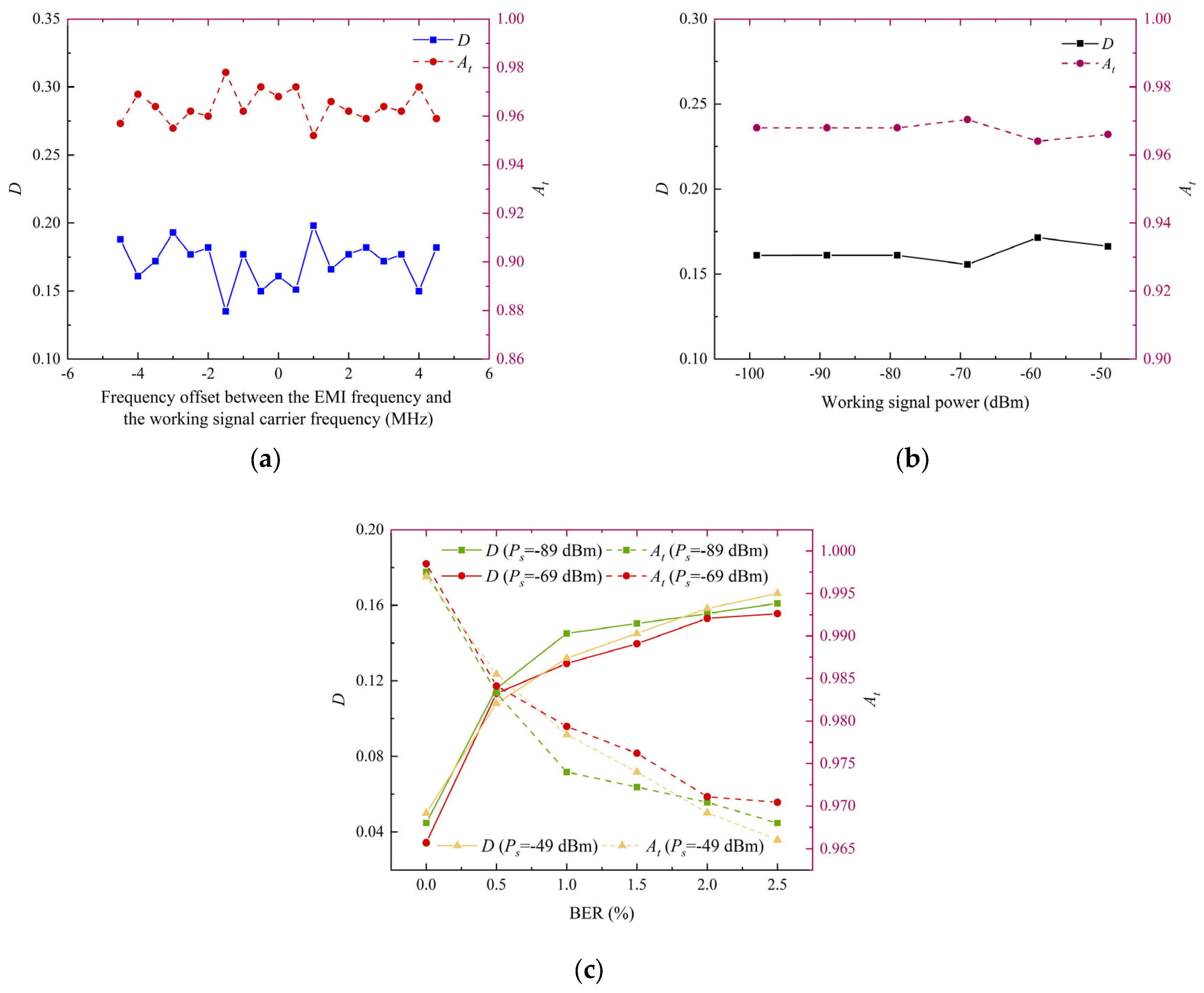 - The measured values for and D of the tested are approximately 0.964 and 0.171, respectively. A key finding is the inverse correlation between and D. Furthermore, both parameters are linked to the data link’s loss-of-lock criterion, governed by the BER. Specifically, as the BER decreases, decreases, and D increases.