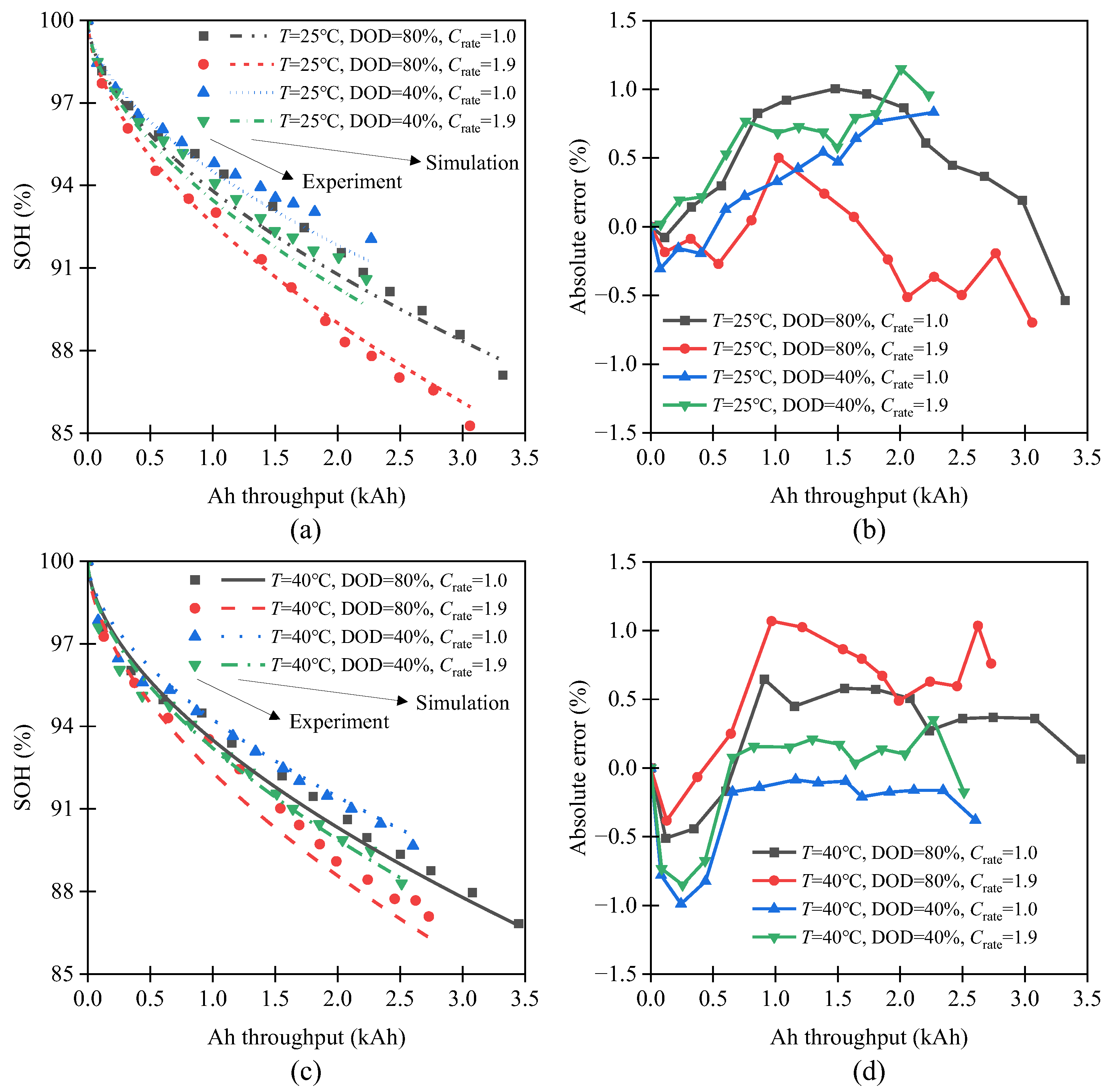 Crates (1C and 1.9C). The validation results show that under different ambient temperatures and charge/discharge conditions, the average absolute error between the model-predicted battery State of Health (SOH) and the experimental values is only 1.75%, as shown in