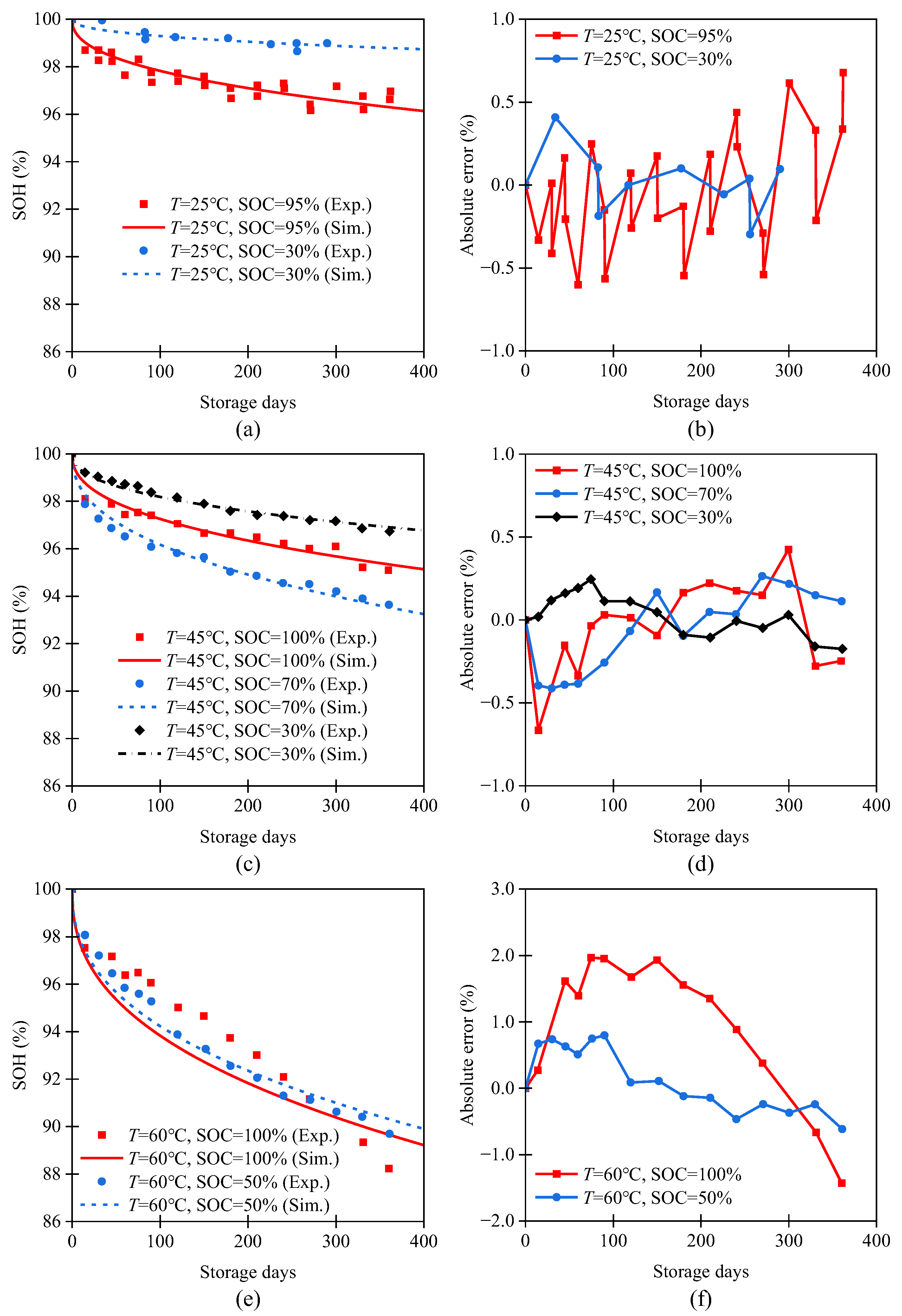 Figure 2. The model achieves a total average absolute error as low as 0.36% in predicting calendar aging under different storage SOC levels (30%, 50%, 70%, 95%, and 100%) and temperatures (25 °C, 45 °C, and 60 °C). Furthermore, as shown in