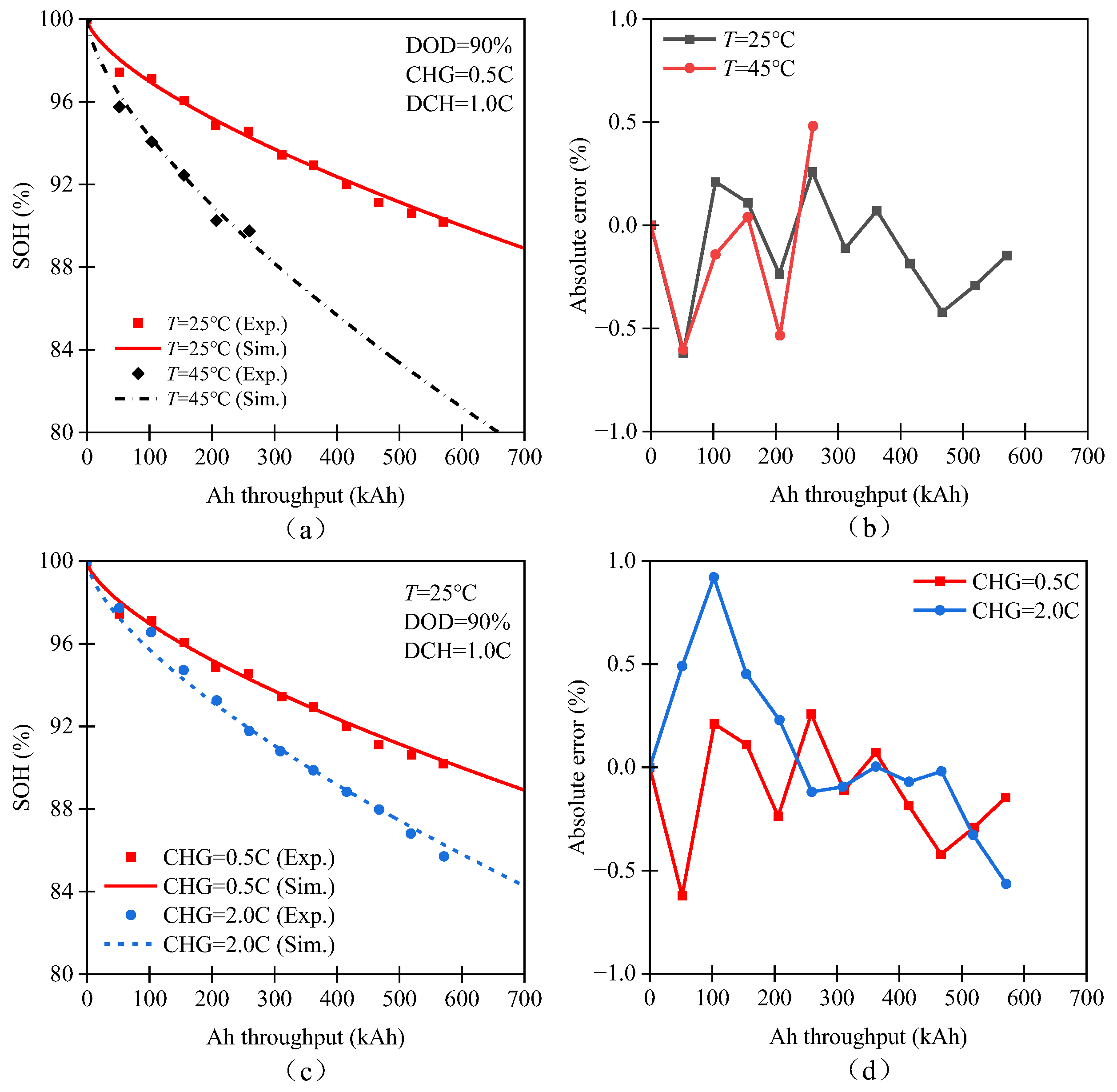 24]. The fitting process aims to minimize the error between model prediction and experimental data, with the optimization goal of minimizing the average absolute error between experimental data points and simulated values. The final parameters obtained ensure the accuracy of the model’s prediction of battery aging under various operating conditions.
