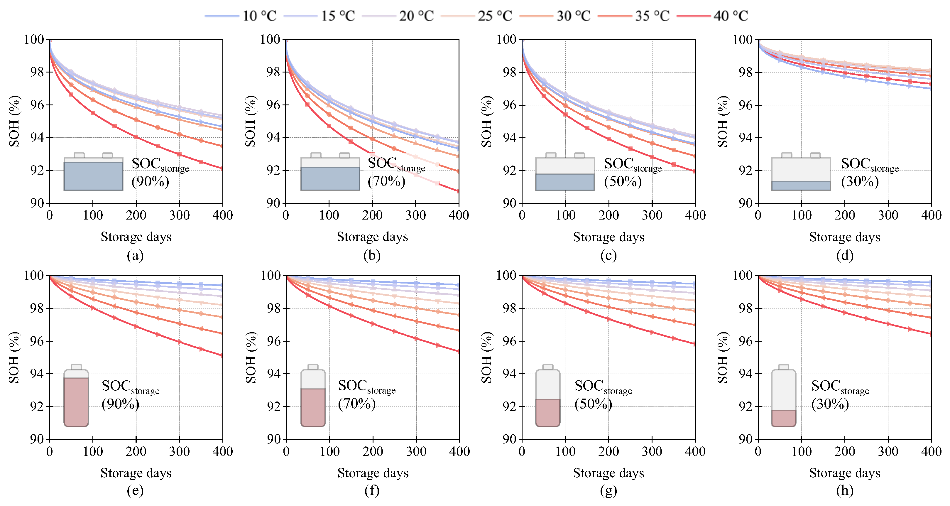 Based on the established aging models for electric passenger vehicle and electric truck batteries, the effects of different storage SOCs and temperatures on calendar aging were analyzed.