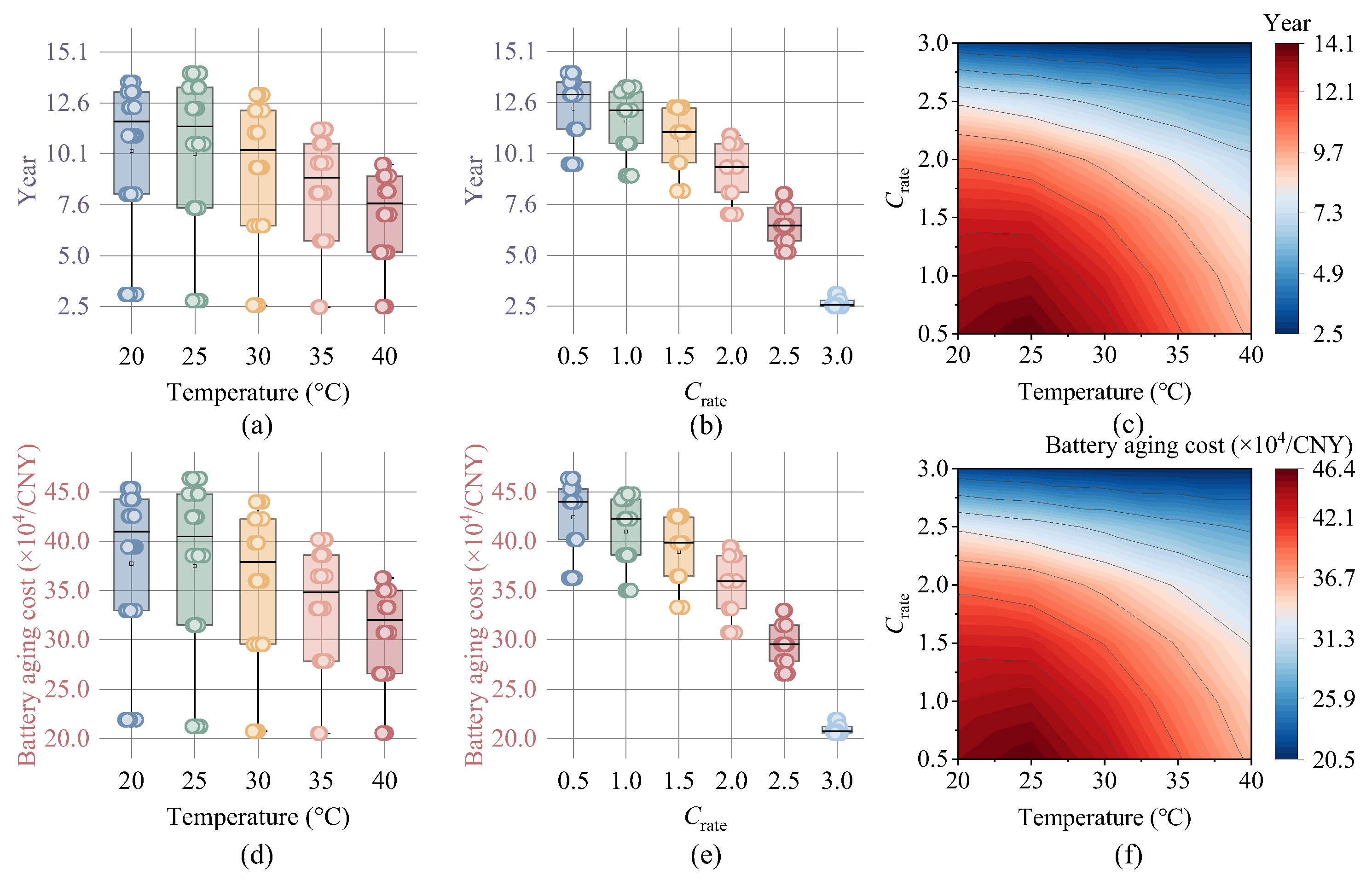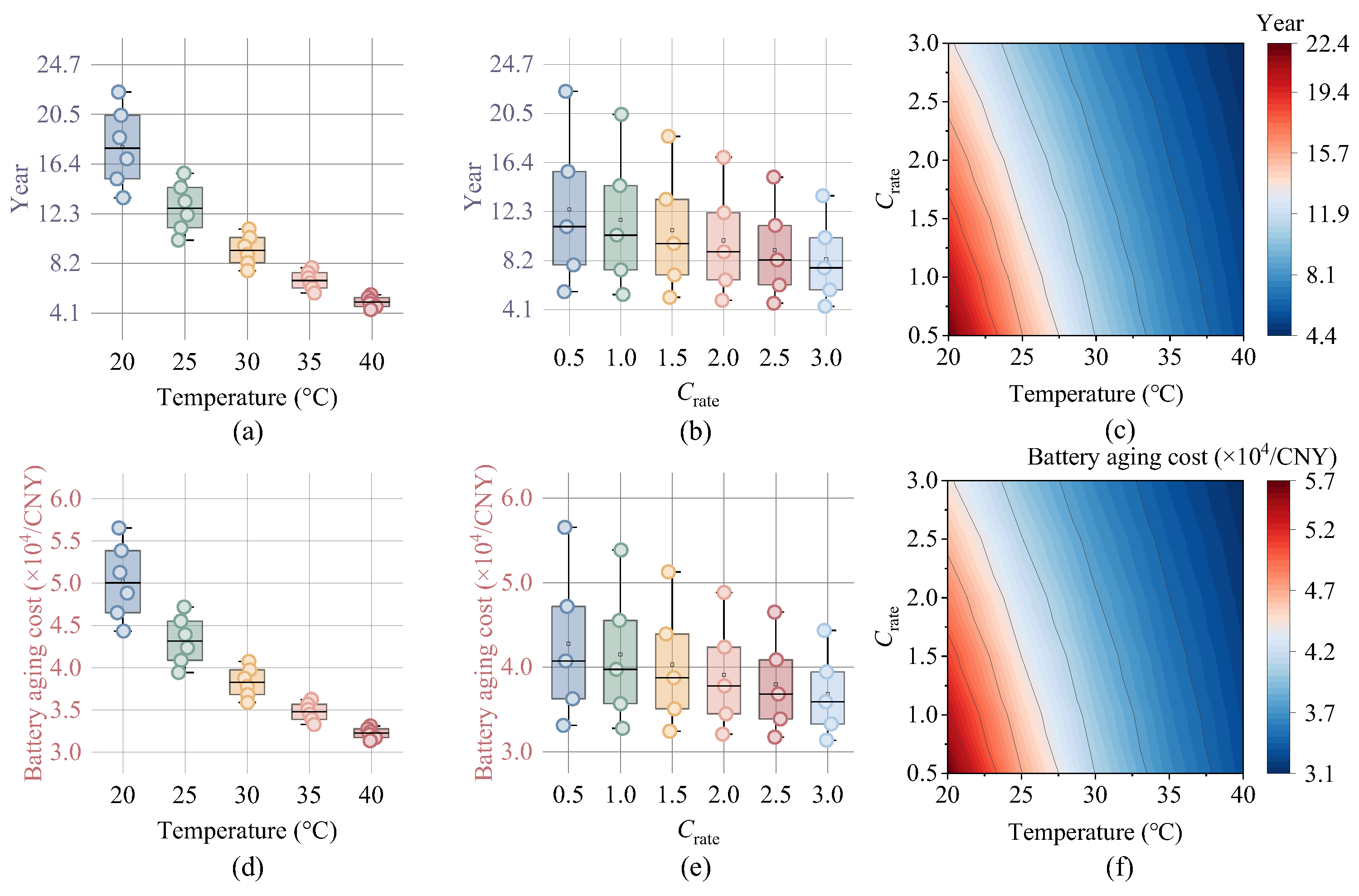 Crate increases from 0.5C to 3.0C. In terms of usage cost, higher operating temperatures lead to lower usage costs, indicating that under normal driving conditions, shorter service periods until battery end of life result in lower costs for EV users.