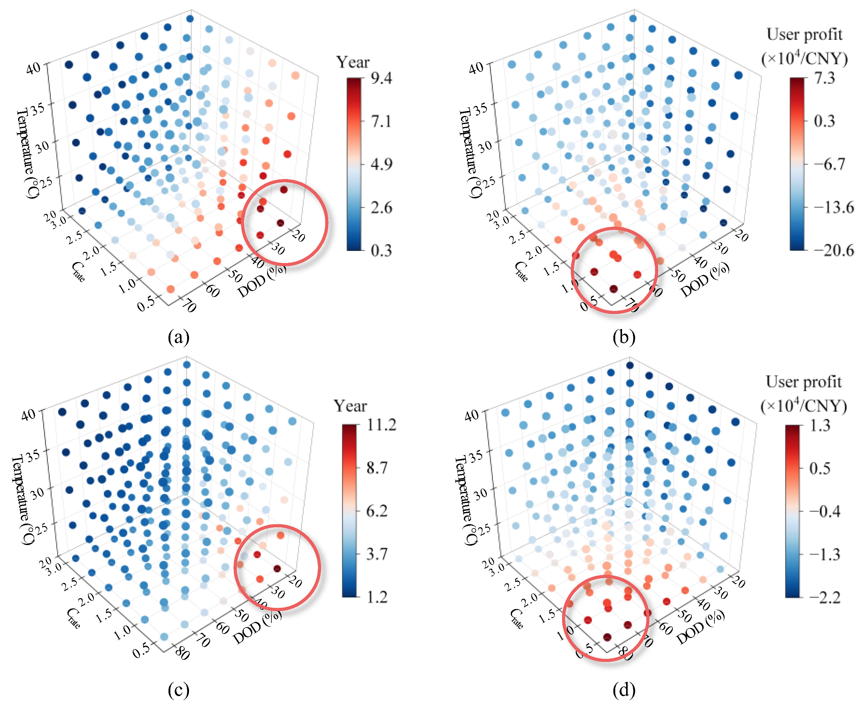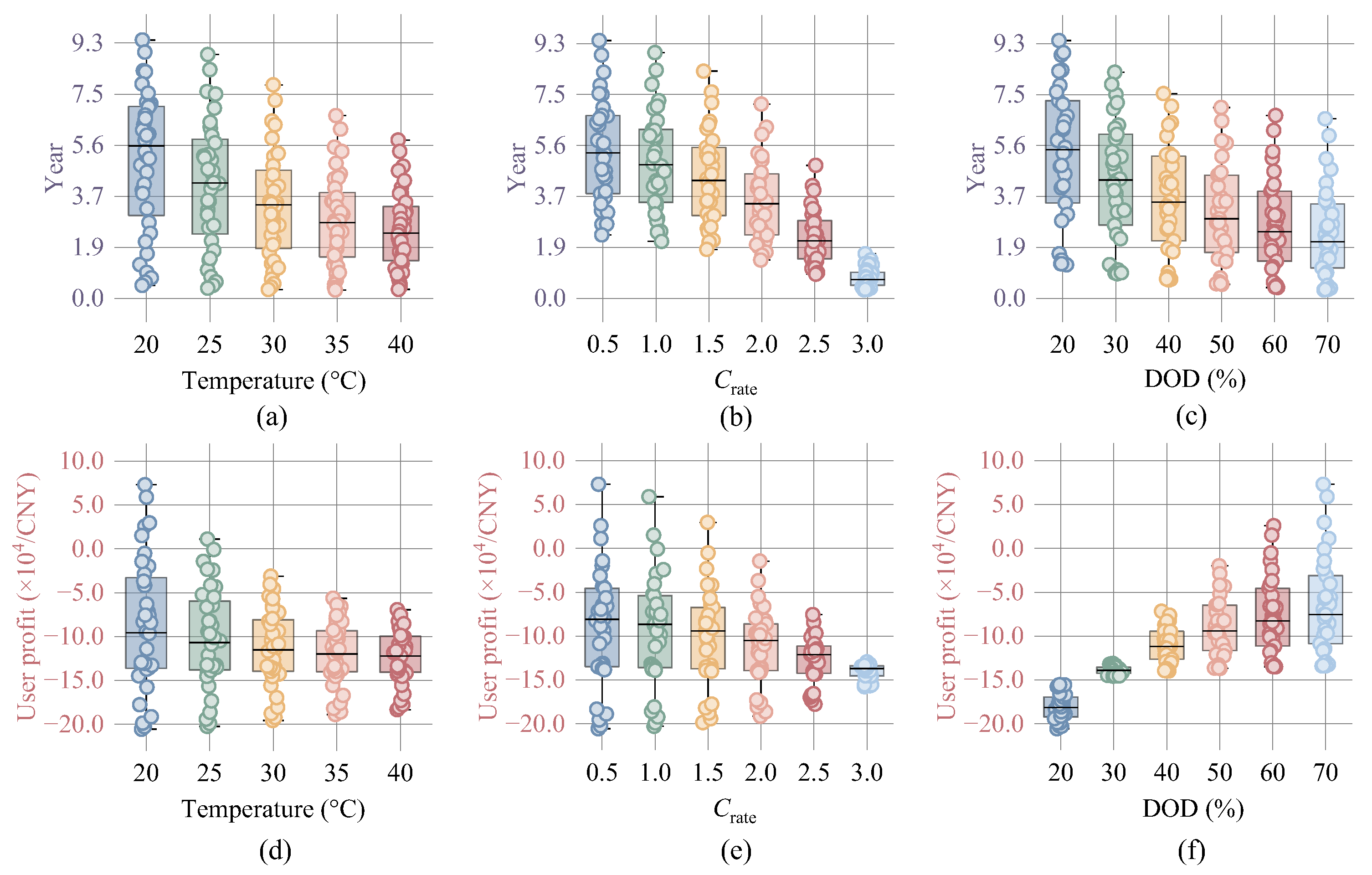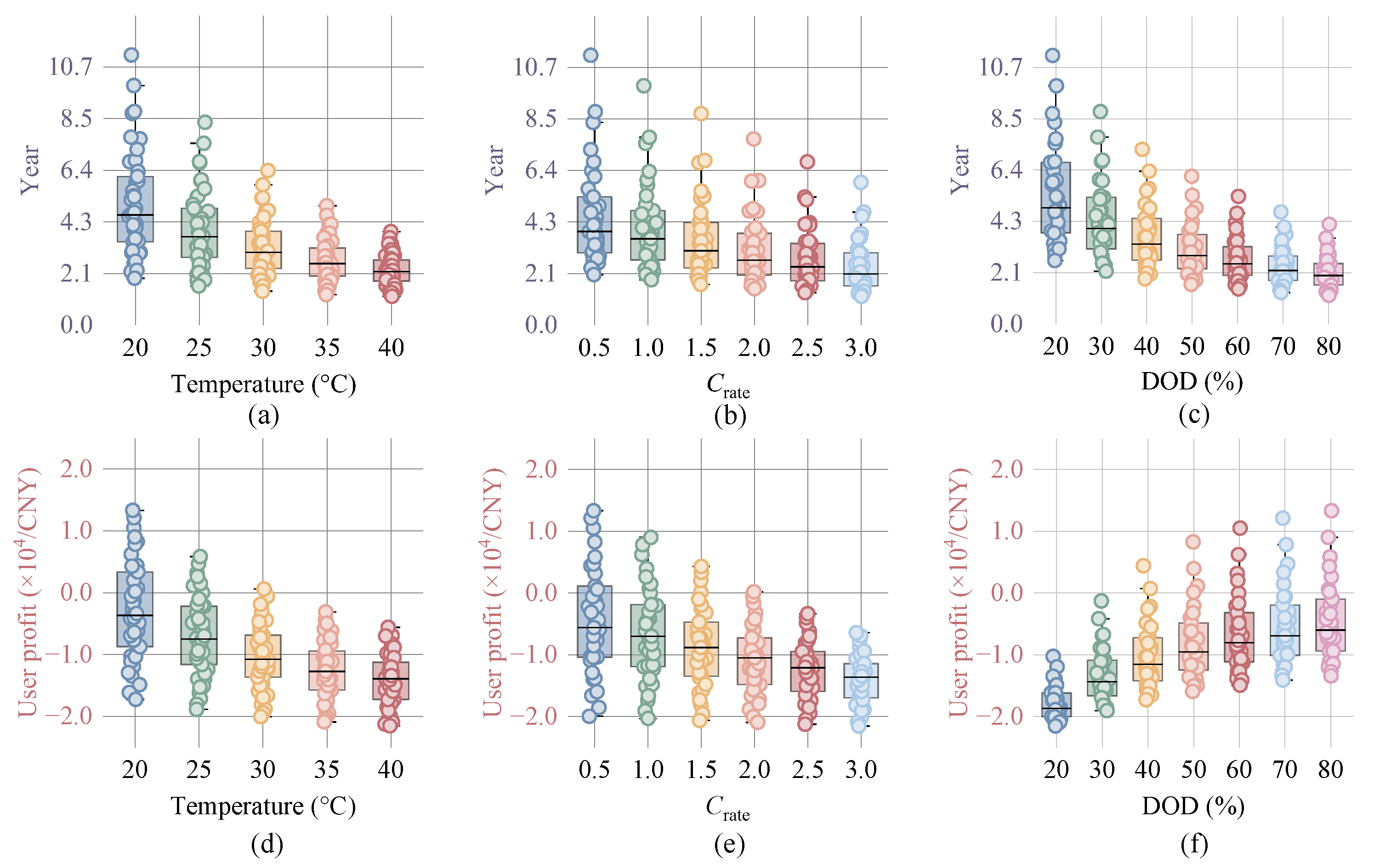 Crate increases from 0.5C to 3.0C, and discharge depth increases from 20% to 80%, service life decreases by 51.19%, 42.82%, and 62.43%, respectively. User net revenue decreases with higher ambient temperatures and increased