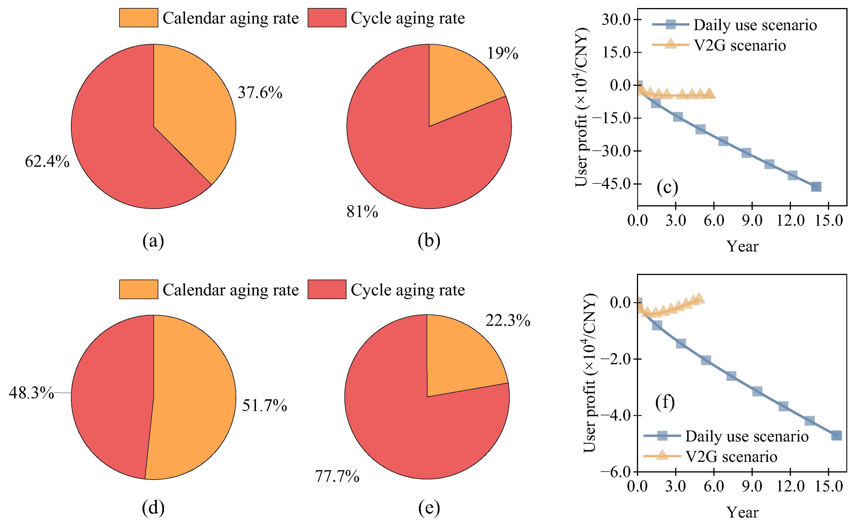 Figure 15 illustrates the composition of battery aging and changes in user revenue for both electric trucks and electric passenger vehicle batteries under the two scenarios.