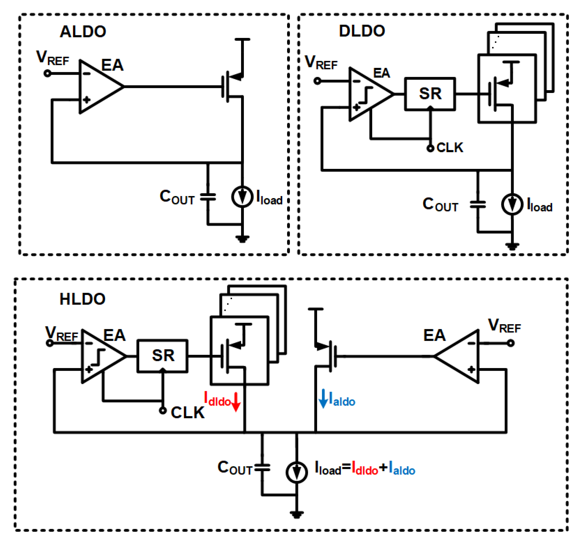 Currently, LDO architectures can be broadly categorized into three types: analog LDOs (A-LDOs), digital LDOs (D-LDOs), and hybrid analog-digital LDOs (H-LDOs), as illustrated in
