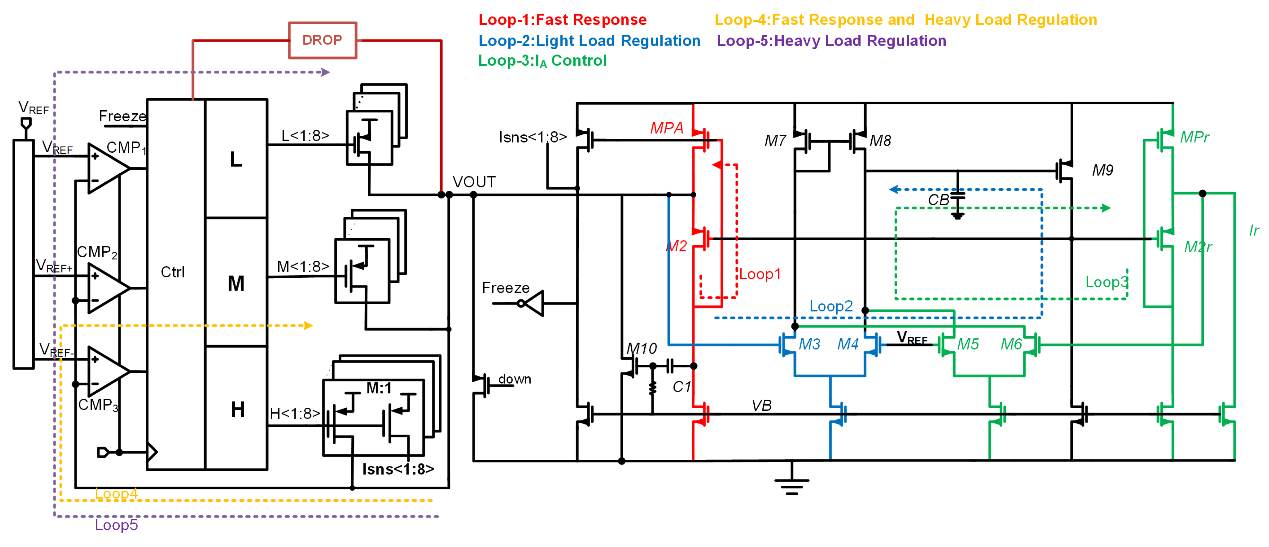 Loop-1 (Fast Analog Auxiliary Loop): This is the fastest loop, formed by the analog power transistor MPA and the common-gate amplifier M1. It provides an immediate, continuous-time response to counteract rapid output voltage fluctuations, effectively handling high-frequency transients.