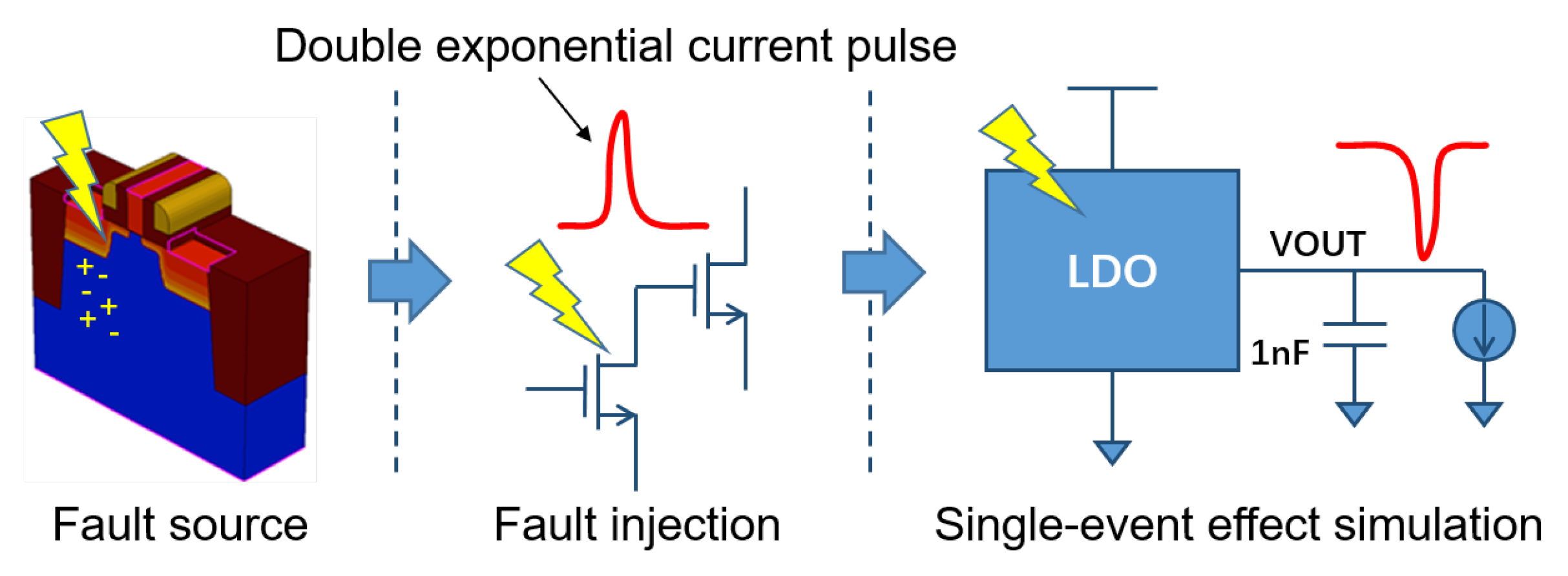 The single-event susceptibility of the LDOs was evaluated by injecting a double-exponential current pulse,