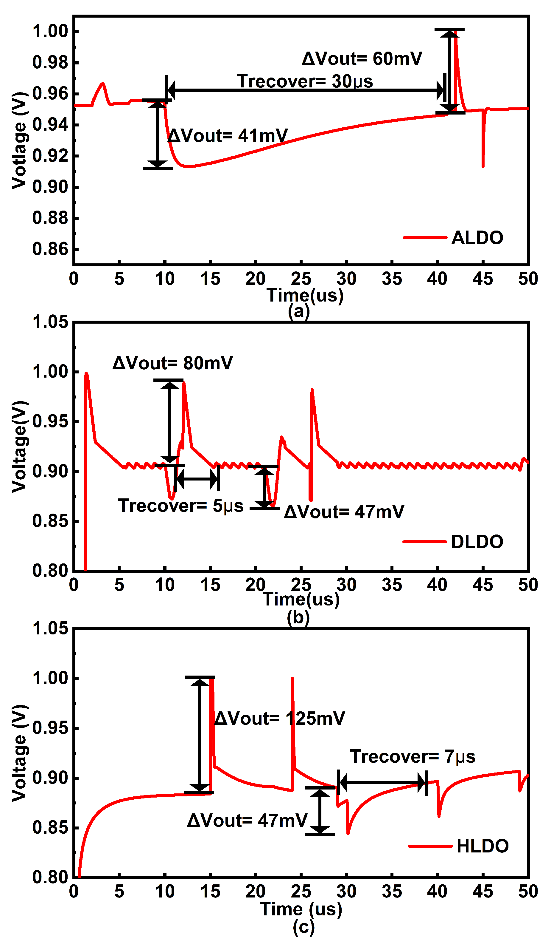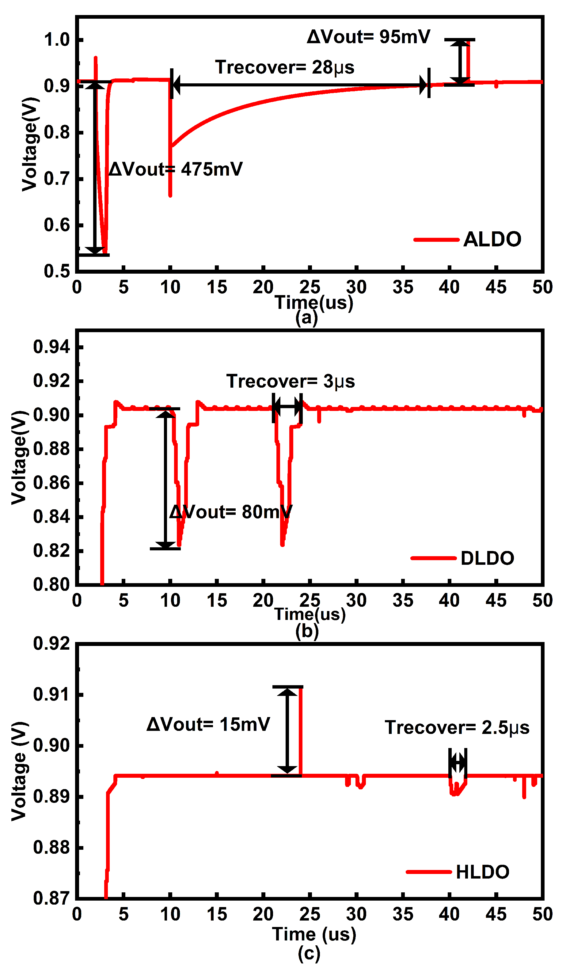 The proposed hybrid LDO (H-LDO) demonstrates the most superior performance, with a significantly smaller undershoot of only 230 mV. This enhancement is directly attributable to its synergistic multi-loop control strategy. The moment the load transient occurs, the ultra-fast analog auxiliary loop (Loop-1) provides an immediate burst of current through MPA, effectively “clamping” the initial voltage drop. Almost simultaneously, the asynchronous falling-edge detection circuit is triggered, pre-emptively enabling additional digital bits to provide sustained current support. This collaborative action between the analog and digital domains ensures a swift and smooth recovery with minimal overshoot and settling time.