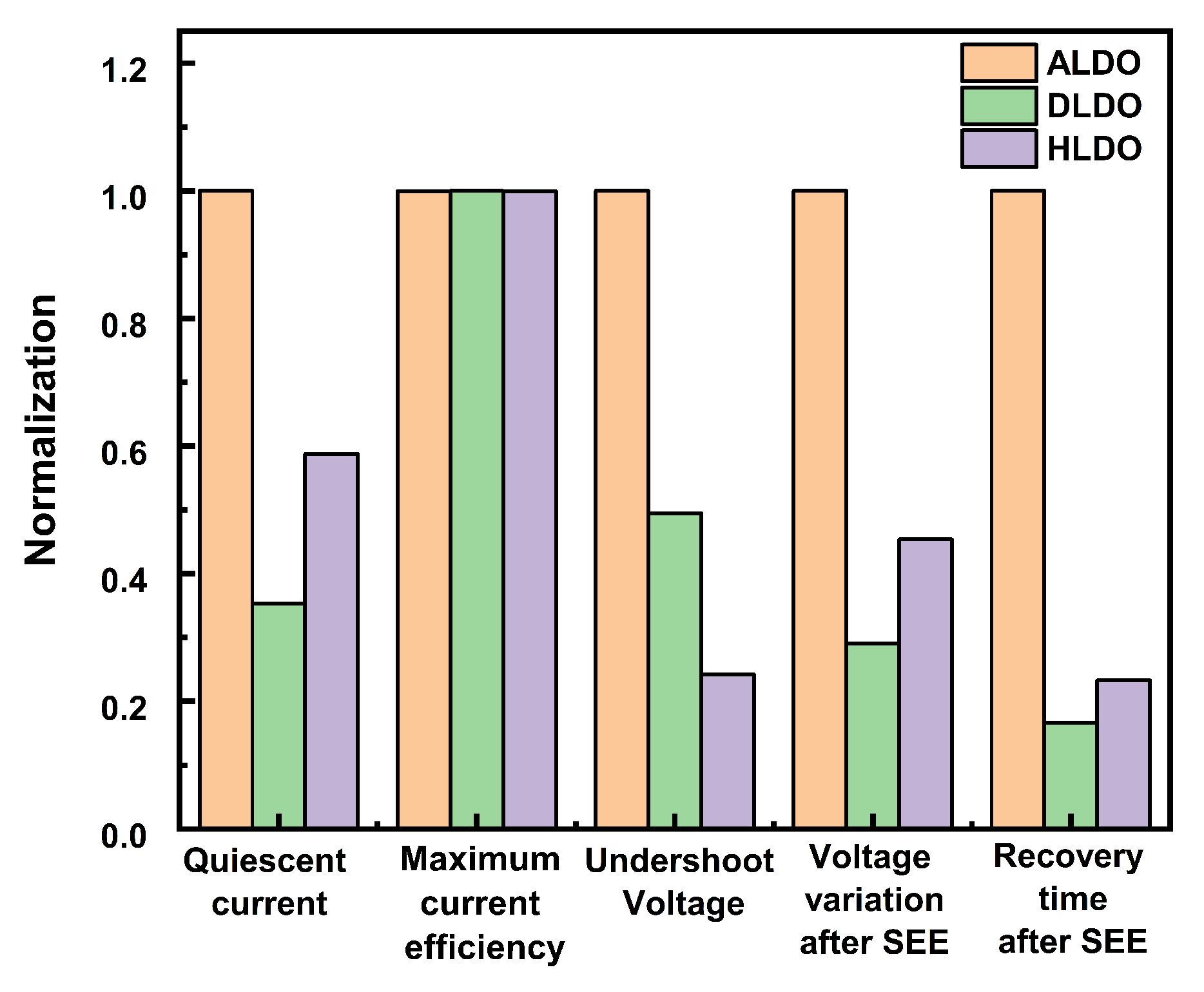 Figure 8 presents a comprehensive radar chart comparing the normalized performance of the three LDOs across key metrics, including SET Susceptibility, Recovery Time, Transient Response, Efficiency, and Quiescent Current. The plot visually confirms that the hybrid LDO achieves a more balanced and superior overall performance profile. It successfully bridges the gap between the analog and digital domains, offering the high efficiency and digital robustness of a D-LDO while retaining the fast transient and low-noise advantages of an A-LDO, all while introducing significantly enhanced radiation hardness crucial for space-grade applications.