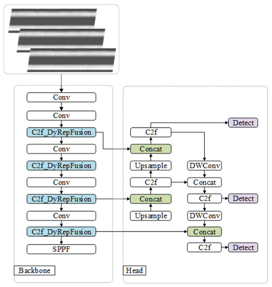 The improved network structure is shown in Figure 1. It includes an input layer, backbone, neck, and head. In the backbone, we stack four C2f_DyRepFusion modules for multi-scale feature extraction. The neck adopts a feature pyramid network (FPN) for multi-layer feature fusion. The detection head retains the three-scale detection of YOLOv8. This design addresses challenges in X-ray tire images such as large scale variation, complex textures, and strong noise interference. By introducing dynamic convolution and channel shuffle, the model enhances feature adaptability and information flow, thus improving robustness and accuracy in complex industrial scenarios.