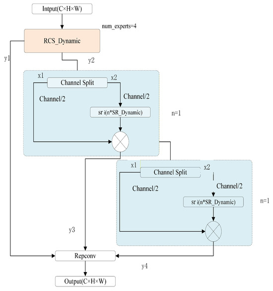 The RCS_Dynamic module (Figure 2) contains two paths: a backbone path with DynamicConv to extract local features, and a residual path (SR_Dynamic) for cross-channel information exchange and dynamic enhancement. The core is the dynamic convolution, which adapts its kernel weights based on input features. Specifically, given input feature map X, dynamic convolution computes a weighted sum of multiple expert kernels: